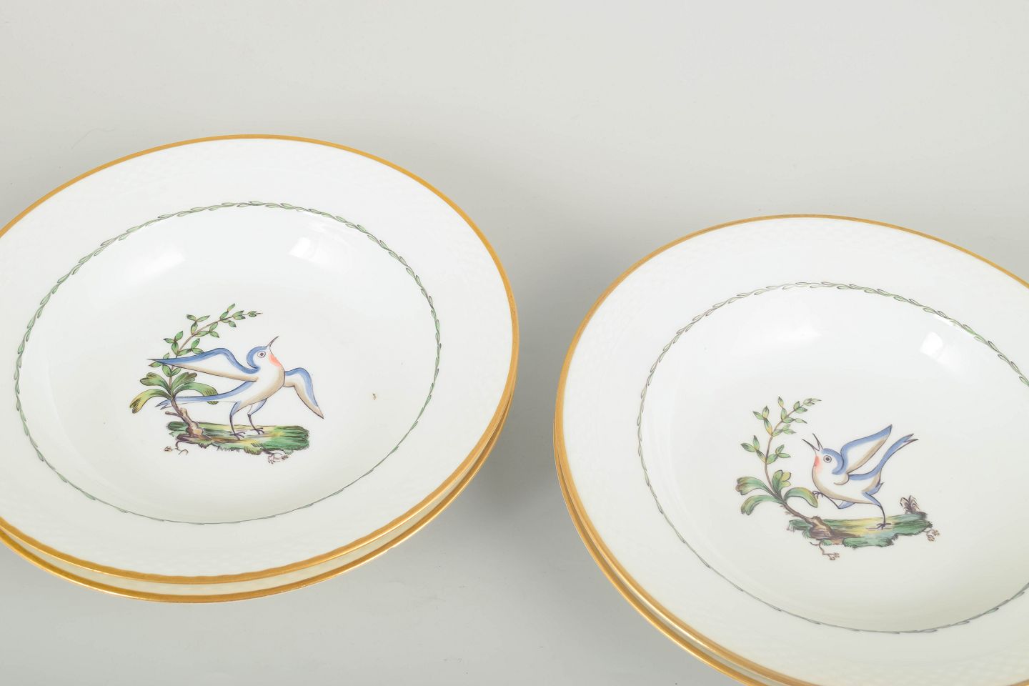Royal Copenhagen – Sæt af fire store dybe tallerkener, tidligt 1900-tal.Sjældne dybe tallerkener i porcelæn fra Royal Copenhagen med motiv af fugle og botaniske elementer (model 550/8107). Hver tallerken er kantet med guldrand og har et elegant, let riflet fletrelief langs kanten.