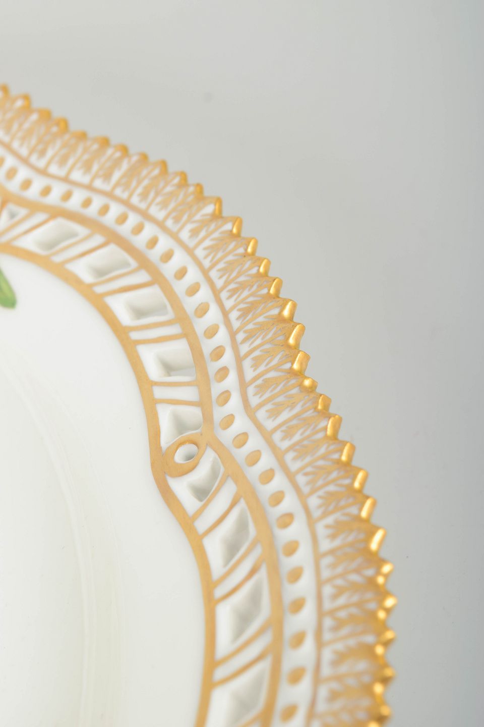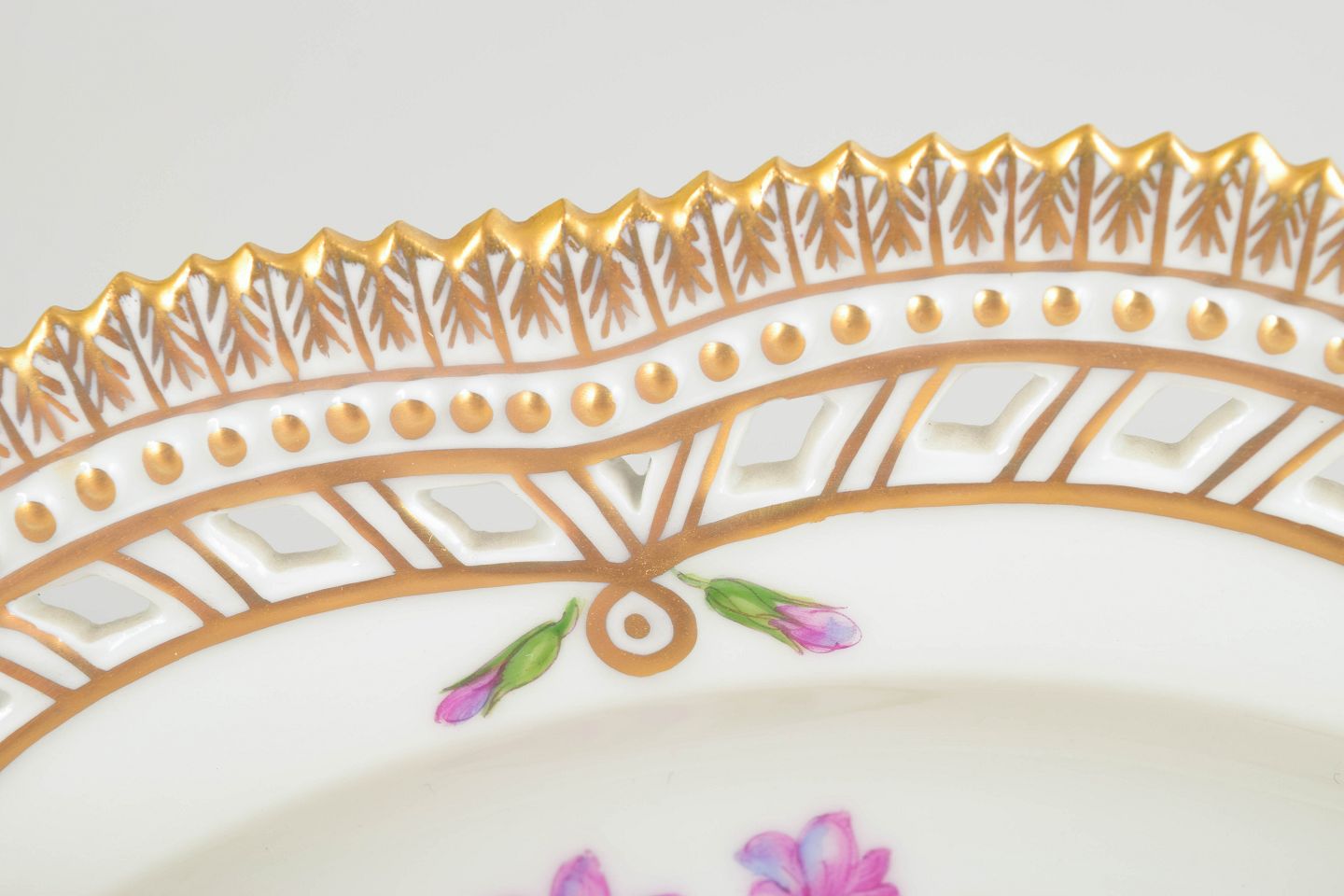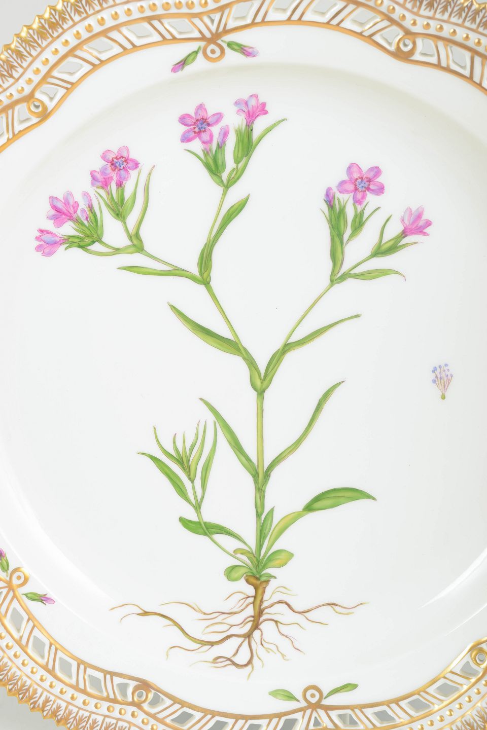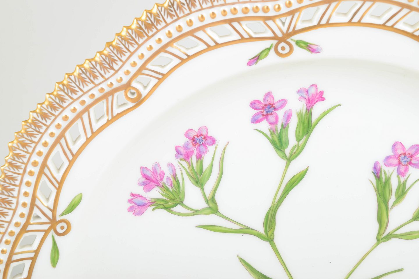 Meget stort Flora Danica-fad med åbent gennembrudt bort, rigt håndmalet med botanisk motiv og forgyldt dekoration.