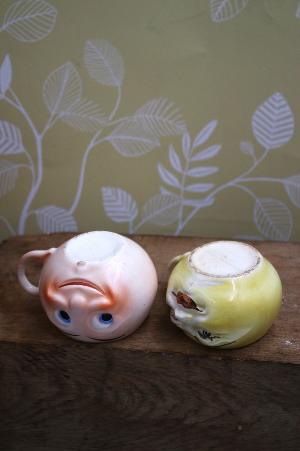 Gamle børnekopper i fajance med sjove ansigter.H: 5,5cm. Dia.: 7,5cm.