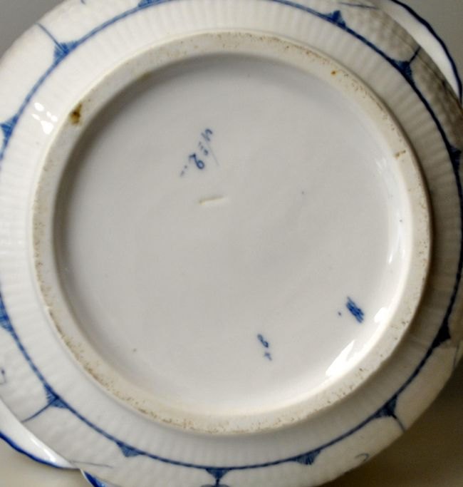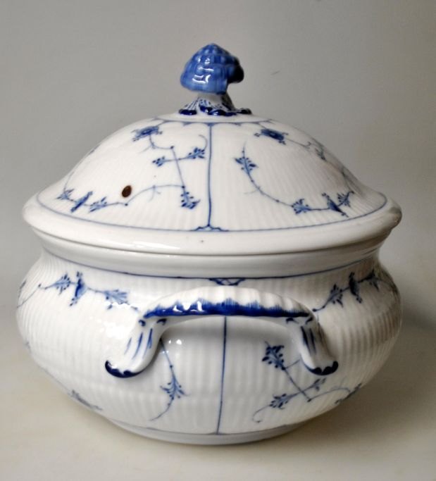 Royal Copenhagen rund terrin, no. 2, musselmalet, riflet,1850 - 1875, København, Danmark. Med låg. Stemplet. H.: 24 cm. Dia.: 24 cm.NB: Terrinlåget har en lille brun brændingsplet og indvendigt er der et lille afslag på lågkanten.