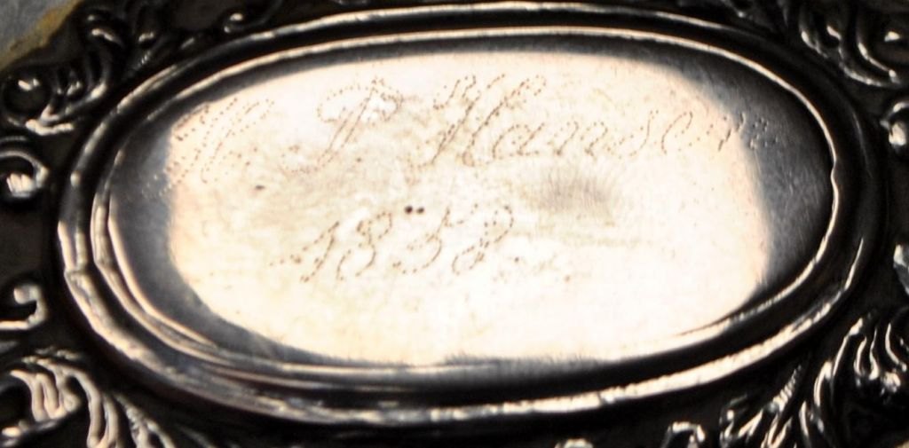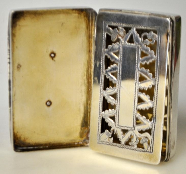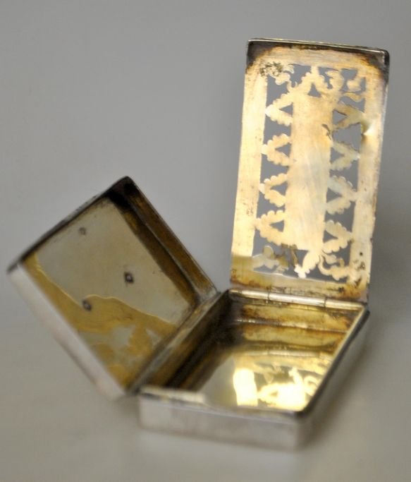Carl Christopher Rode (1826 - 1902) Åbenrå, Danmark: Lugtedåse i sølv. Stemplet med mestermærke og byvåben. Indvendig lueforgyldt og gitter med agern og egeløv. 7,5 x 4,5 x 1,5 cm. Vægt: 68 gram.På låg indgravering: H. P. Hansen 1858.