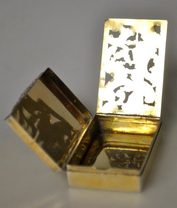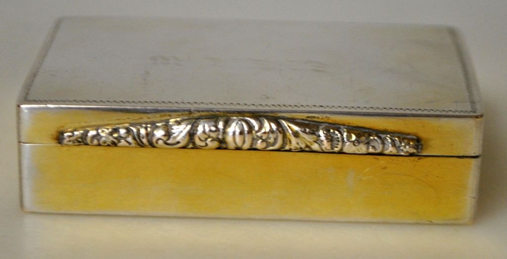Peter Erichsen (1826 - 1869) Haderslev, Denmark: Silver centbox. Stamped with master's mark and city coat of arms. Inside gilded and lattice with rococo patterns with jumping deer, house and trees. 6.5 x 4.5 x 1.8 cm. Weight: 54 grams.Under bottom engraving: JP Holm and E. Simonsen.