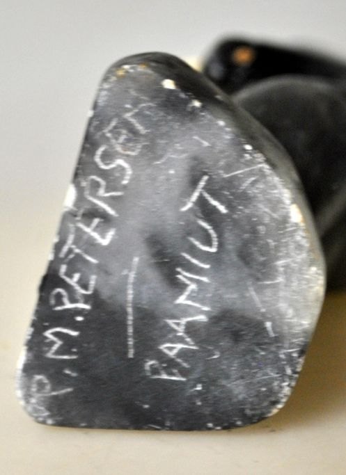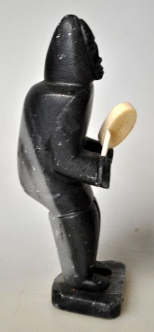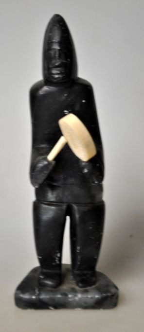 Grønlandsk fedststensfigur af mand med tromme, 20. årh. Udformet af E. M. Petersen, Paamiut (Frederikshåb). H.: 12.5 cm.Perfekt stand!