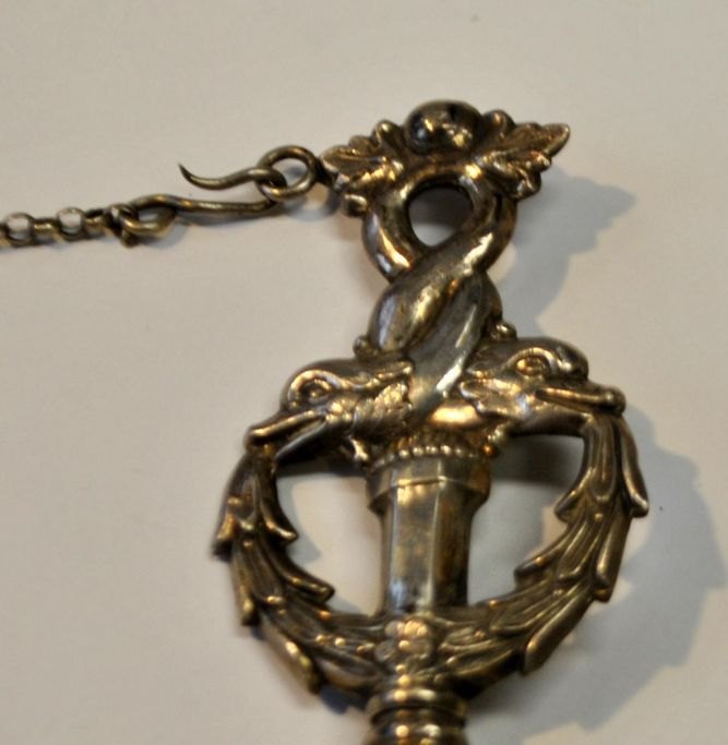 Nåleetui, sølv, 19. årh. Med kæde. Dekoreret med anker og delfiner. Ustemplet. Med indgravering: CM. L.: 11,5 cm.Proveniens: Familie ved Tønder.