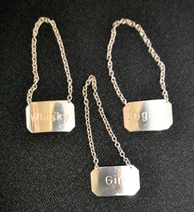 Axel Holm Sølvsmedie (1967 - 1982) København: Sølv spiritus mærker, 20. årh. Sterling sølv. Stemplet. Til whisky, cognac og gin. 2,5 x 4,5 cm.Emne nummer: 28653