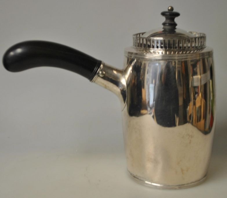 Martin Hinrich Petersen (1756 - 1824) Haderslev, Danmark: Stjert empire kaffekande i sølv. Glat korpus. Håndtag og knop i ibenholt træ. Mesterstemplet og bymærke. På side kartusche: A.W. H.: 21 cm. Vægt: 579 gram.Påbunden ligeledes indgraveringer fra flere ejere.