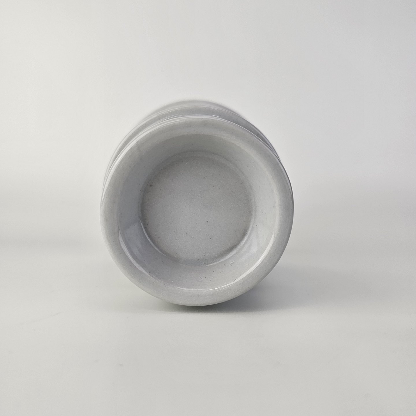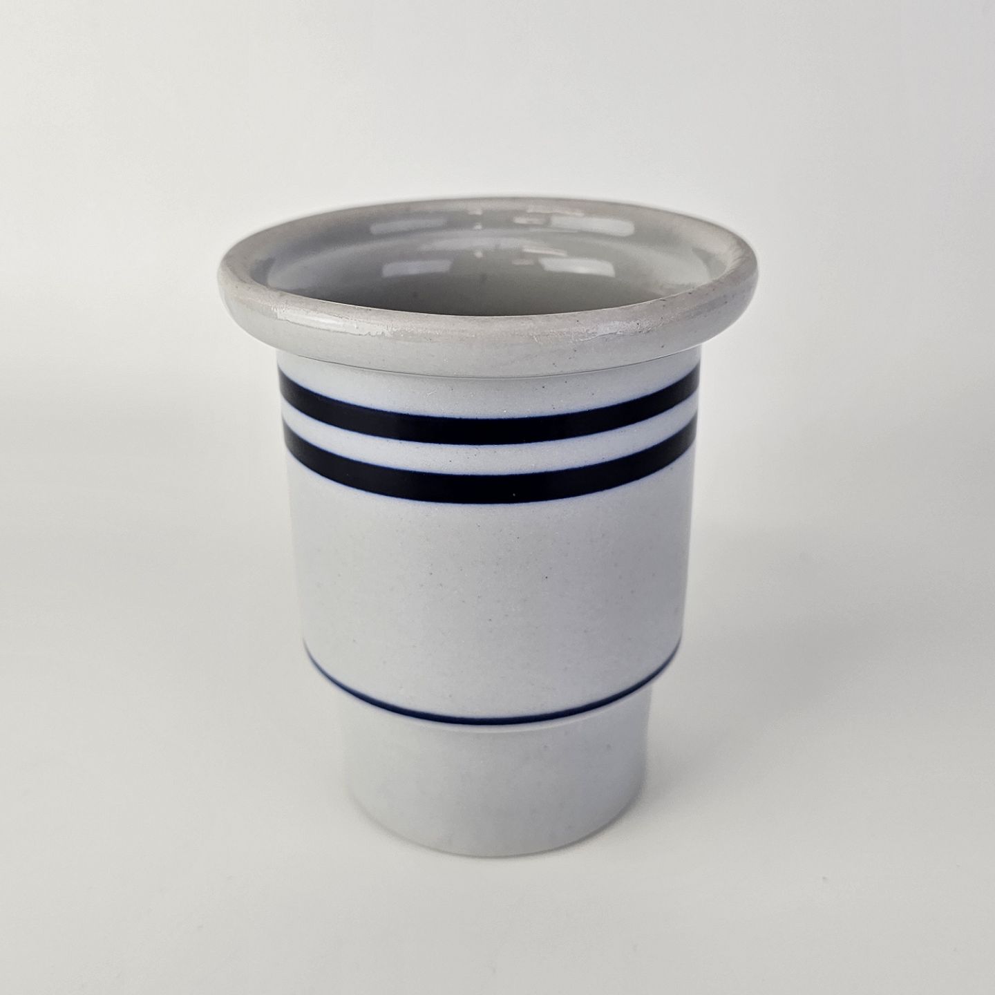 Krukke i glaseret stentøj med dekoration af tre blå striberFormgiver Niels Refsgaard