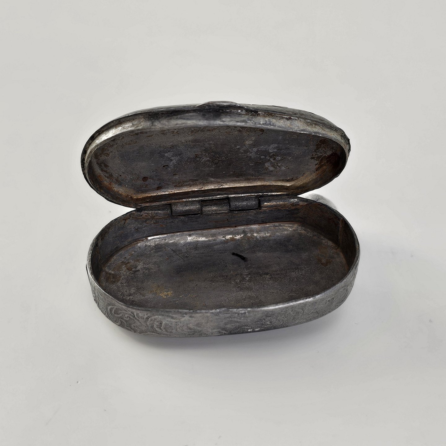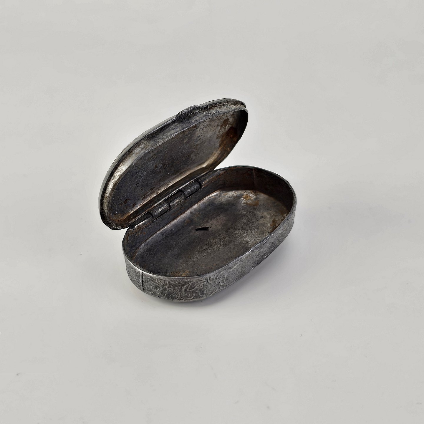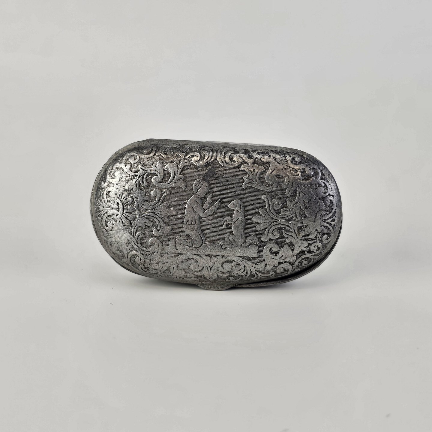 Pilleæske i tin med motiv af en dreng og en hund omgivet af bladmotiverProducent ukendt