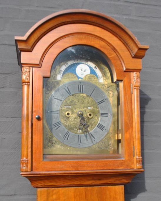 Dansk standur, 20. årh. Urfabrikant og urmager Anker Luplau Dinesen, Randers. No.: 325. Standur i mahogni med urhus med kvartsøjler. Urværk med månefase og kalender med måneder og dato. Med timeviser. Skiv i messing med romertal. H.: 210 cm. B.: 44 cm. D.: 24 cm.Perfekt stand!
