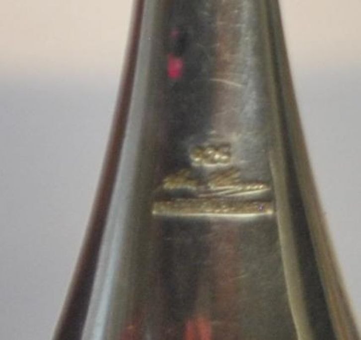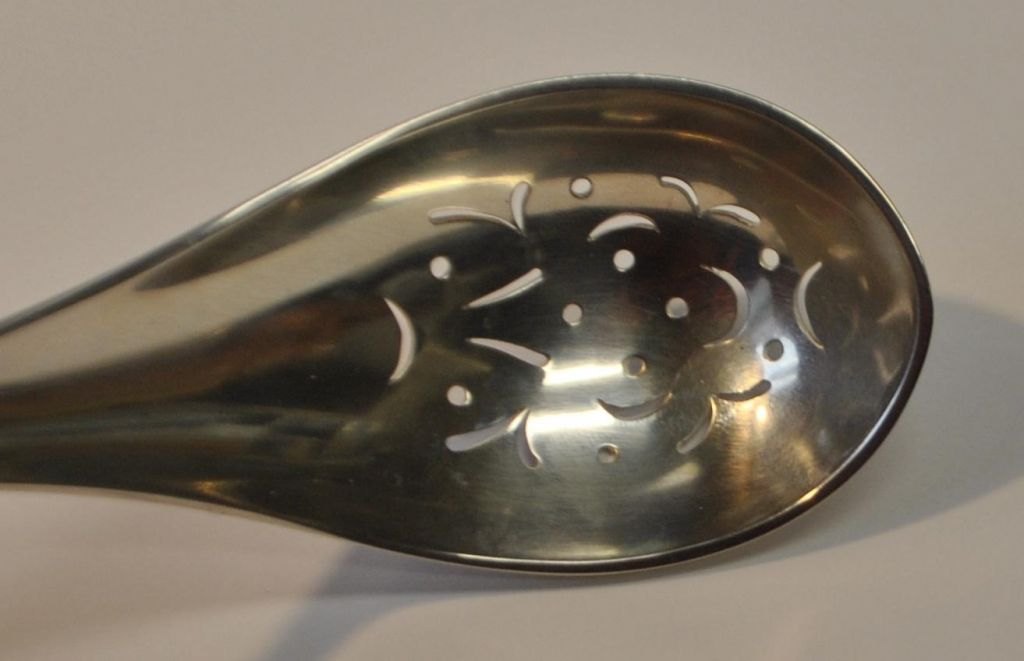 Hans Hansen sterling is ske, 20. årh. Kolding, Danmark. Med huldekorationer i laf. Stemplet: Hans Hansen 925 sterling Denmark. L. 17,5 cm. Vægt: 64 gram.Perfekt stand!