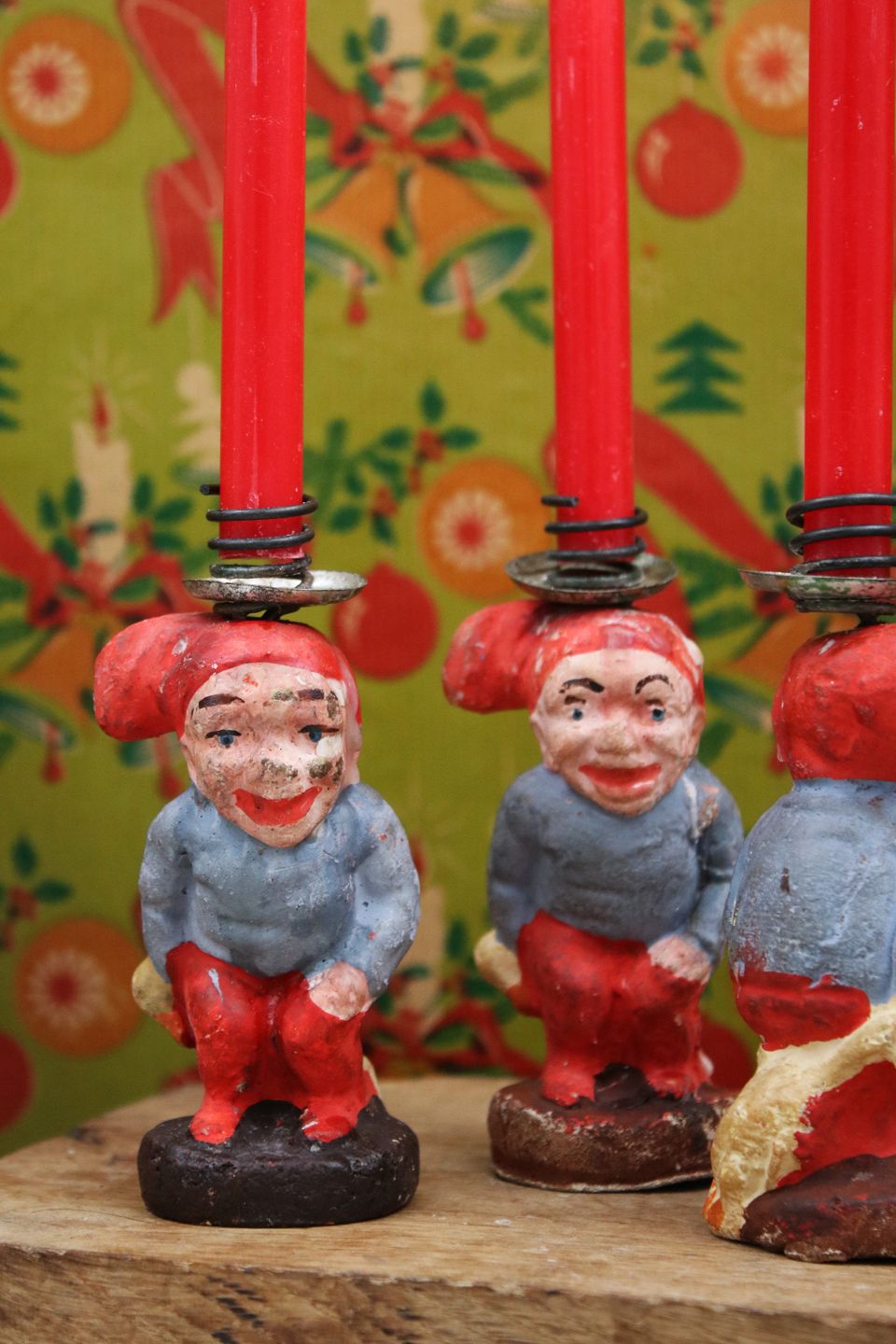 Søde små julenisser med gås på ryggen i bemalet gips med lysholder i toppen til et lille julestearinlys. Højde: 10,5cm.(3 stk. haves på lager)