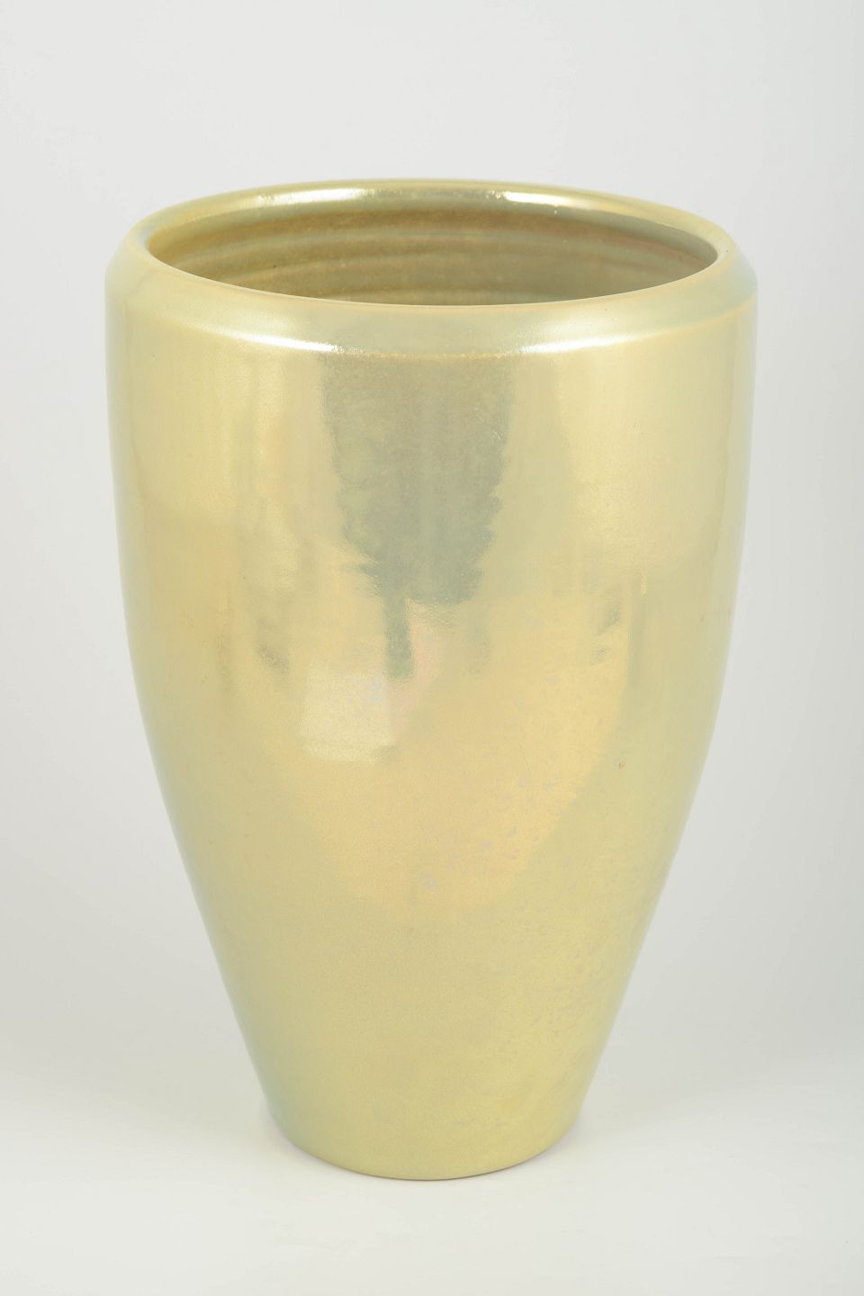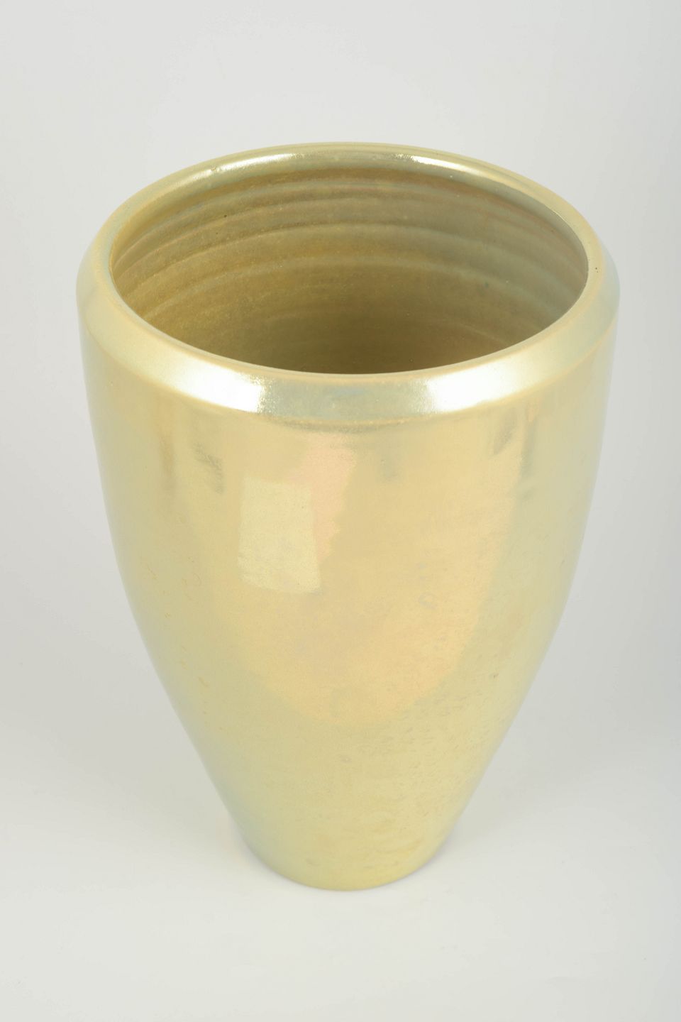 Håndlavet vase i keramik med en smuk, iriserende perlemorsglasur i lyse gyldne toner. Formen er klassisk konisk med let afrundet åbning, hvilket giver vasen et elegant og tidløst udtryk, typisk for Mobachs håndværkstradition.