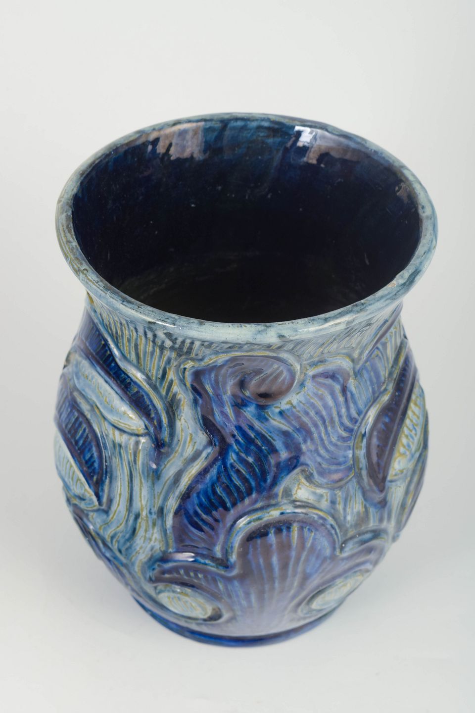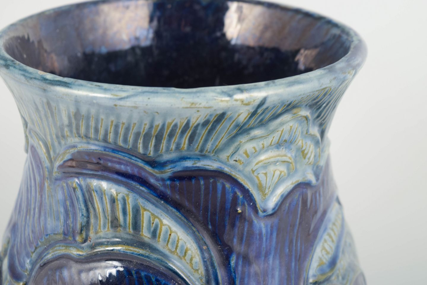 Håndlavet keramikvase i udpræget Art Nouveau-stil med organiske, reliefdekorerede linjer og dyb blå/grøn løbeglasur. Et tidligt dansk kunsthåndværkseksempel fra perioden omkring 1. verdenskrig.