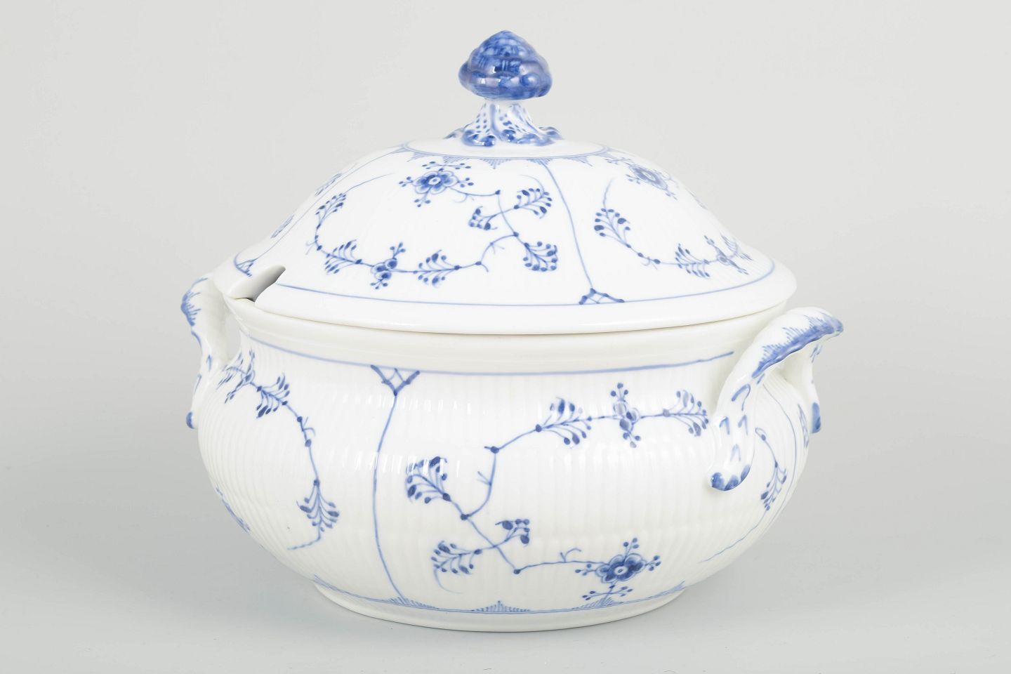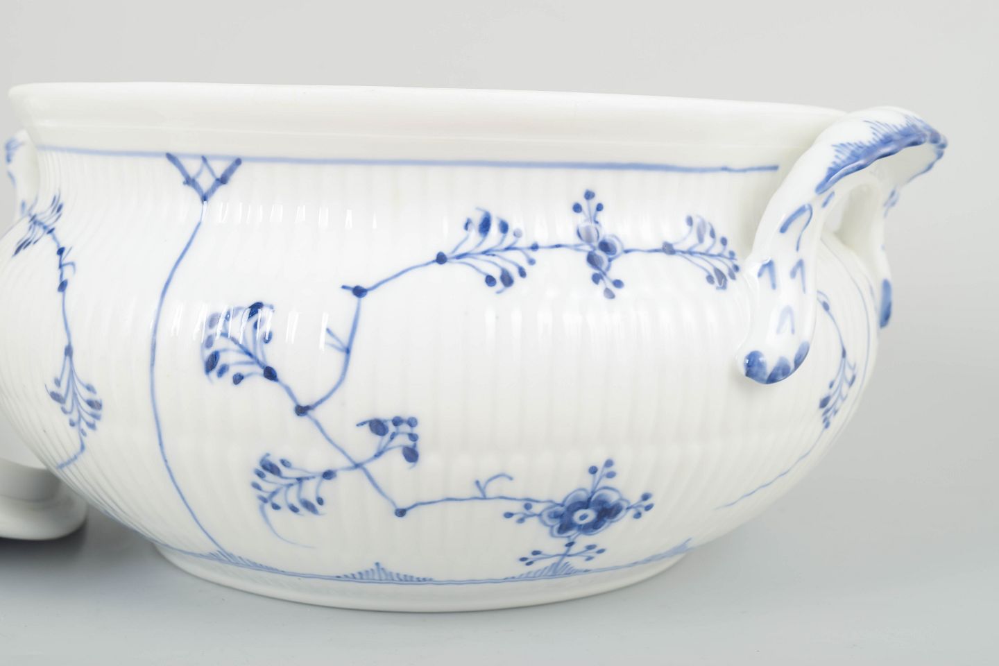 Stor og kraftfuld suppeterrin i musselmalet riflet porcelæn, smukt håndmalet i koboltblå på riflet korpus. Terrinen har markante sidehåndtag, generøs volumen og et låg med dekorativ knop.