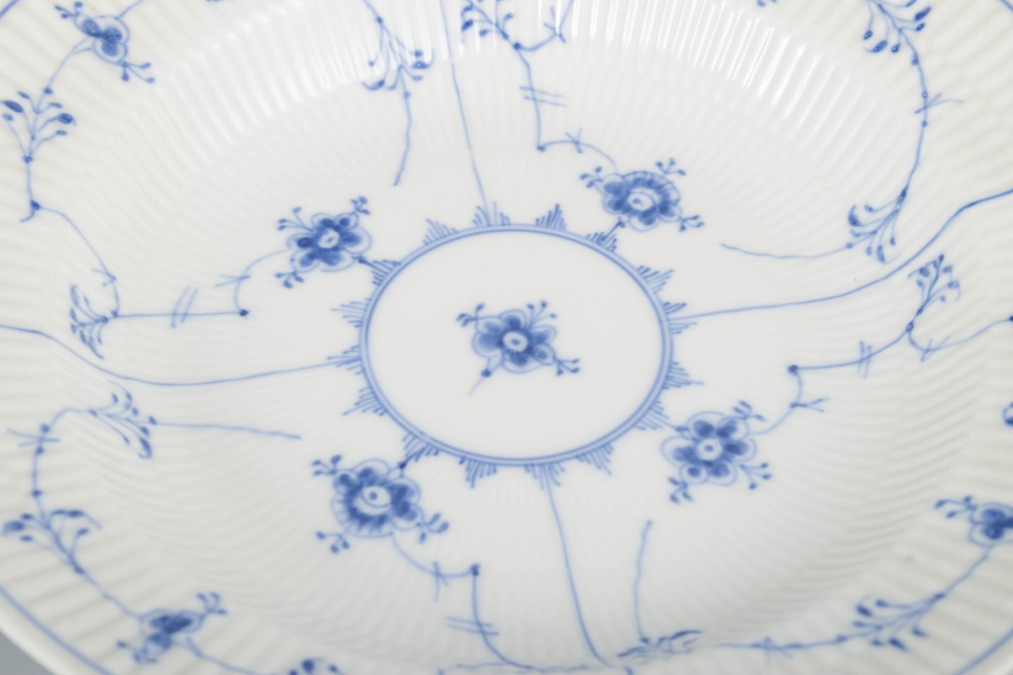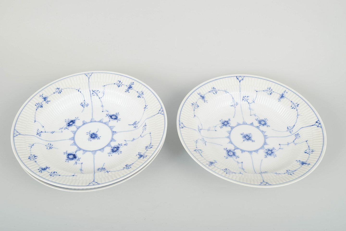 Set of three deep plates in classic “Blue Fluted” porcelain with hand-painted blue decoration and fluted body. A refined and early 20th-century example of Royal Copenhagen craftsmanship.