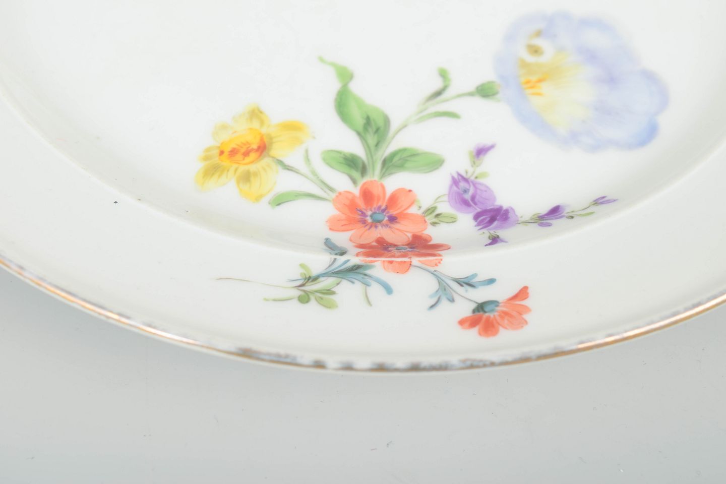 Meissen, two plates, hand-painted.Two elegant porcelain plates with hand-painted floral decorations in classic Meissen style. Both examples feature a fine gold rim.