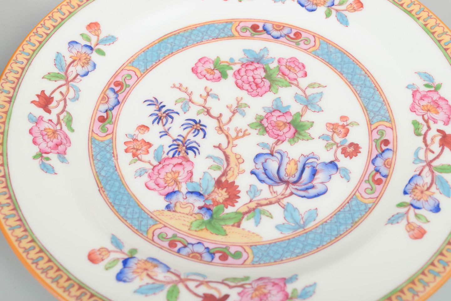 Set of four faience plates with colourful orientalist floral decoration in pink, blue and turquoise tones. Classic Cauldon design with gilt rim.