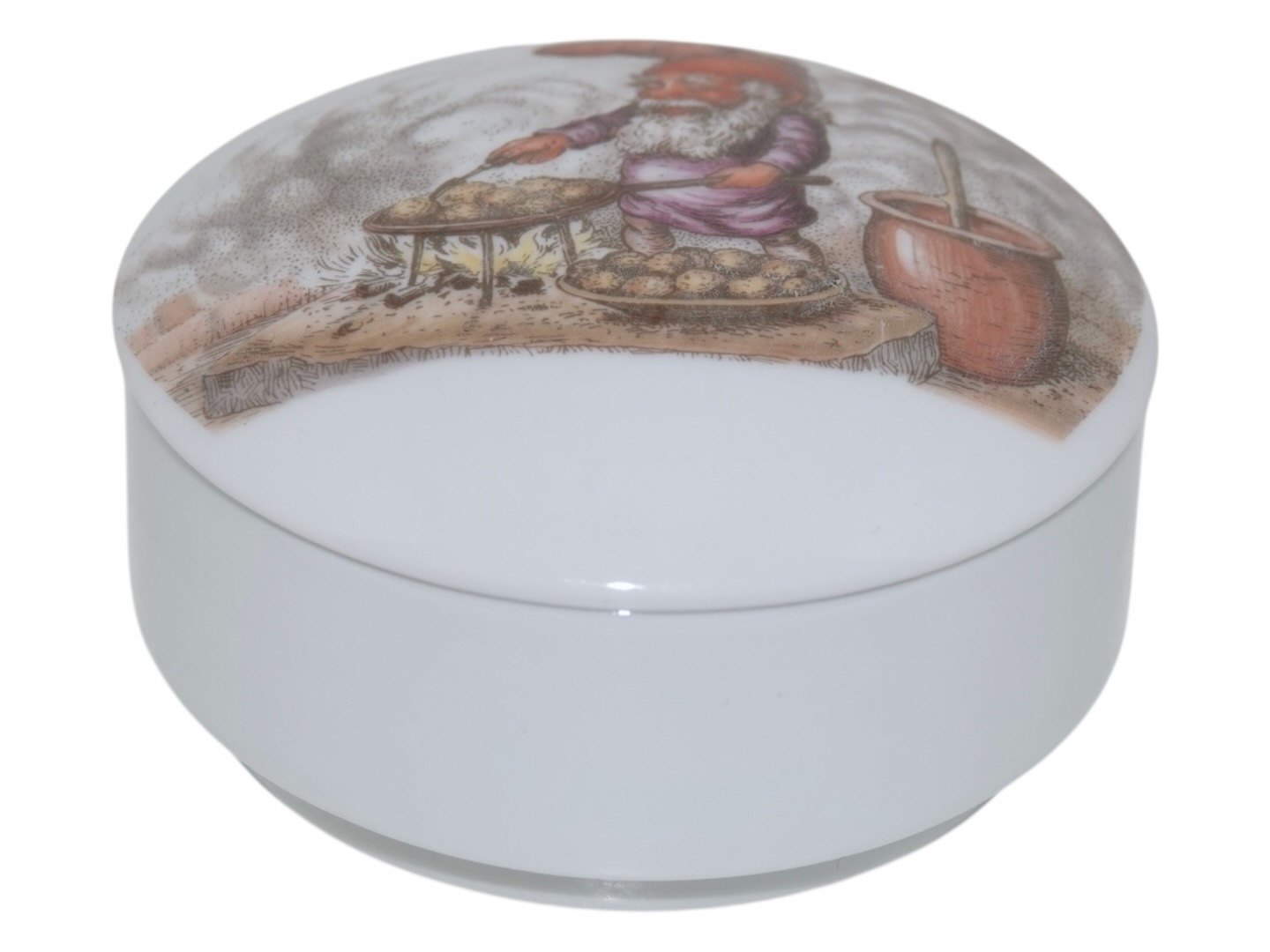 Bing & Grøndahl, rund bonbonniere med julenisse der bærer æbleskiver.Af fabriksmærket kan det udledes, at denne er produceret mellem 1970 og 1983.