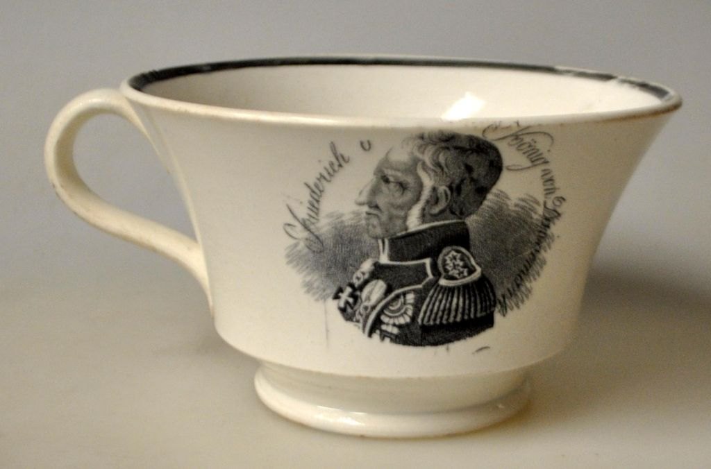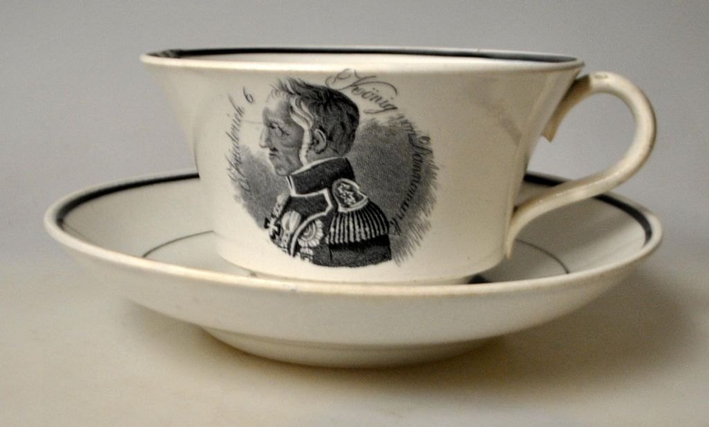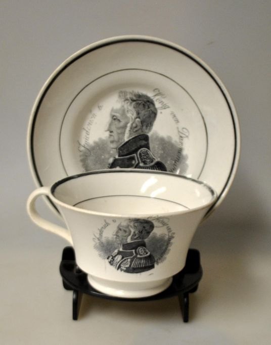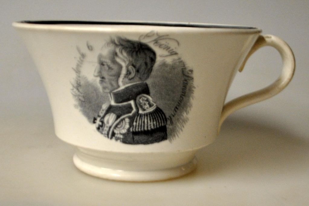 Coffee cup with saucer, faience, 19th century. With King Frederik VI's portrait and text in German: Friederich 6, König von Dannemark in transfer technique. Leg faience with green glaze lines. Cup: H.: 7.5 cm. Dia.: 12.5 cm. Saucer dia: 17 cm. The saucer is stamped with an anchor and BF 2.Frederick VI was King of Denmark between 1808 and 1839.