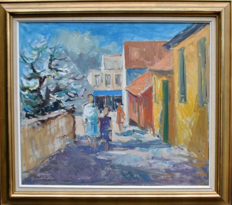 Nielsen, Svend (1908 - 1993) Danmark: Scene fra Allinge. Bornholm. Olie på lærred. Signeret. 60 x 70 cm.Indrammet: 78 x 85 cm.