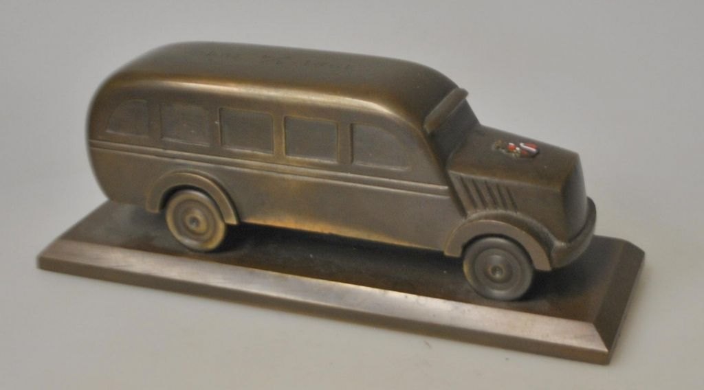 Massiv bronze rutebil, 1946. Med emblem i emajle på front for: Danmarks Bilruter (DBR). L.: 16,6 cm. B.: 5,8 cm. H.: 6,5 cm. På taget indgravering: 1921 - 1/4 - 1946. Vægt: 1.665 gram.Danmarks Bilruter var en Landsforening. Denne bil stammer fra Nordjylland og er givet i gave ved et jubilæum.