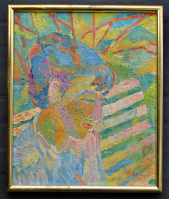 Rørup, Viggo Julius (1903 - 1971) Danmark: En kvinde på en bænk. Olie på lærred. Signeret. 38 x 30 cm. Indrammet: 49 x 41 cm.Verso stempel fra Kunstforeningen i København, 1964, som no. 26.