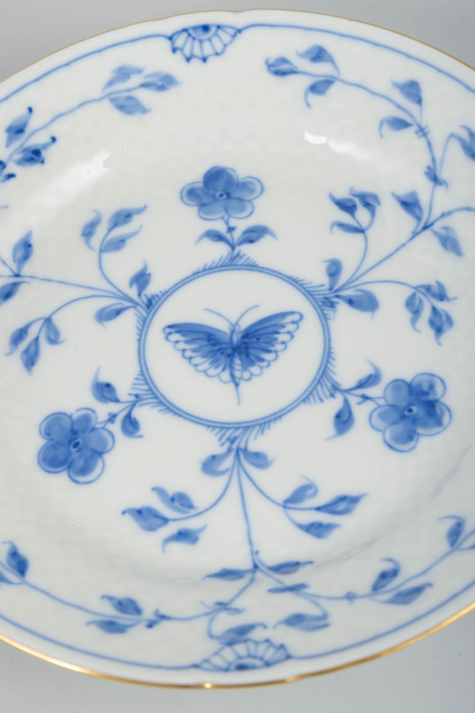 Bing & Grøndahl, grundlagt i 1853 i København, er internationalt anerkendt for sit håndmalede porcelæn og sine klassiske blå dekorer. Sommerfuglemotivet er et af fabrikkens mest poetiske mønstre, hvor naturinspirerede elementer kombineres med fine, tidstypiske detaljer såsom guldkanten.