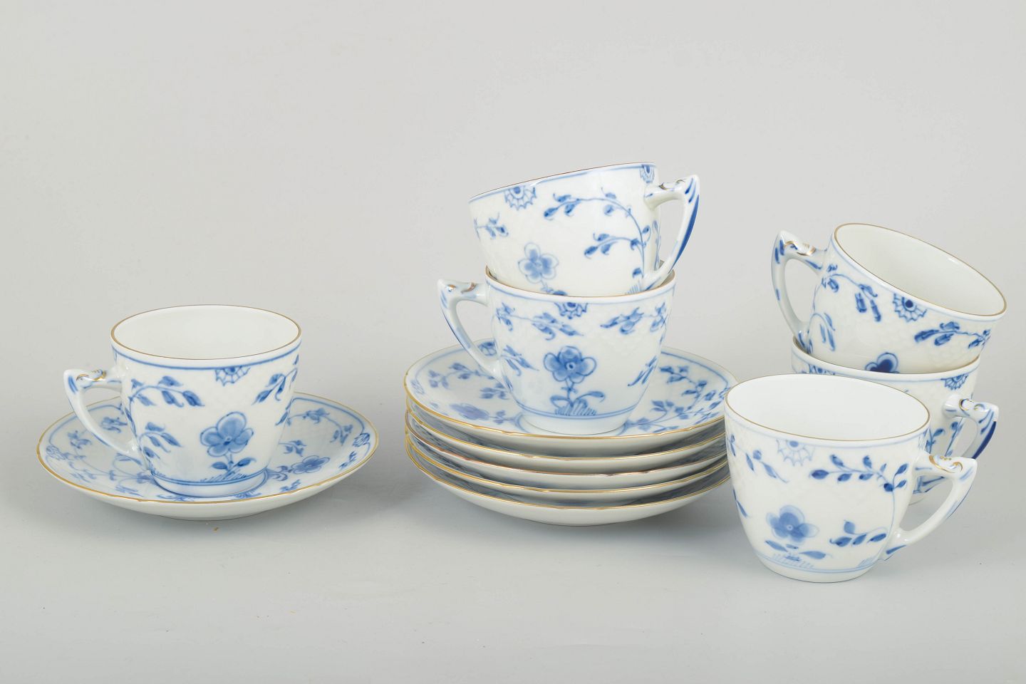 Bing & Grøndahl, sæt med seks kaffekopper med underkopper i det klassiske håndmalede dekormønster Kipling med gulddekor.Kopperne viser den karakteristiske blå flora på hvid porcelænsgrund.