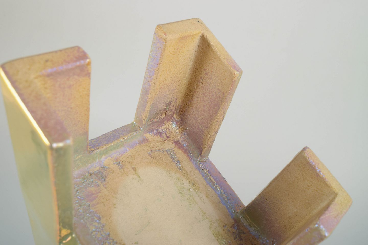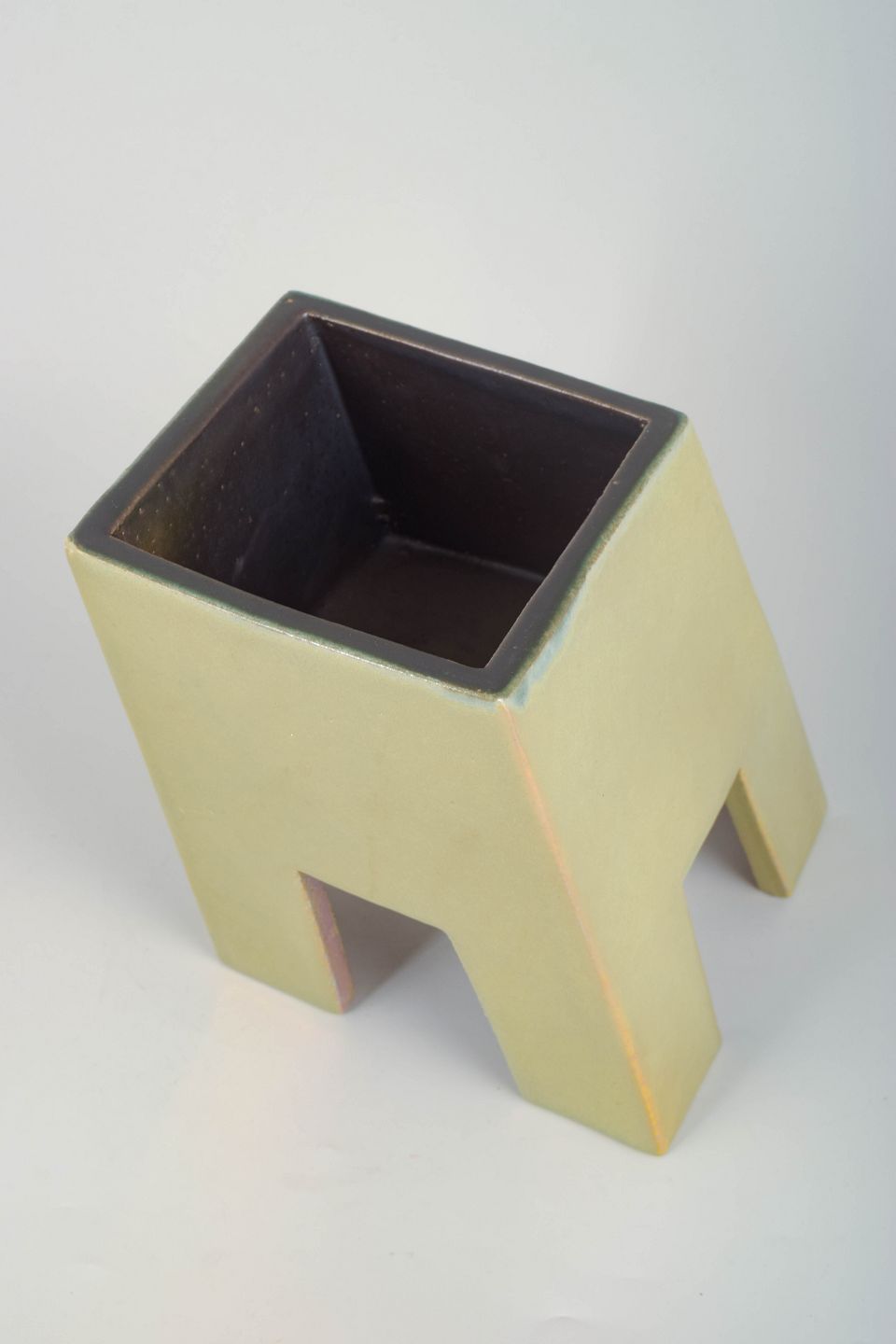 Skulpturel og geometrisk formet vase i stentøj, udført med en mat, håndglaseret overflade i lyse, afdæmpede toner. Et karakteristisk eksempel på Mobach-værkstedets modernistiske tilgang, selv når værkerne ikke er signeret.