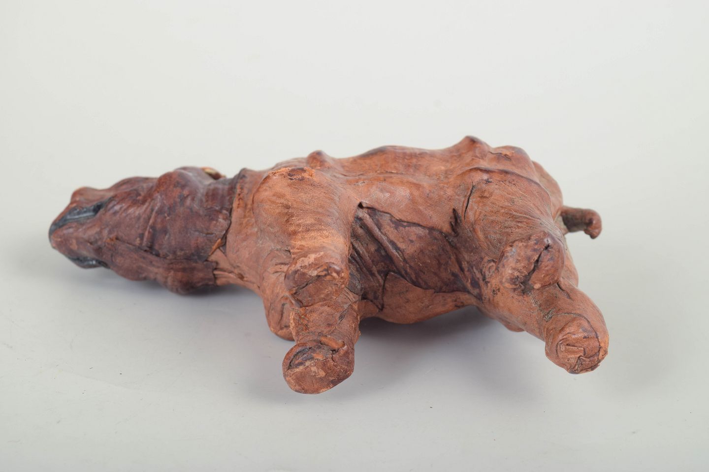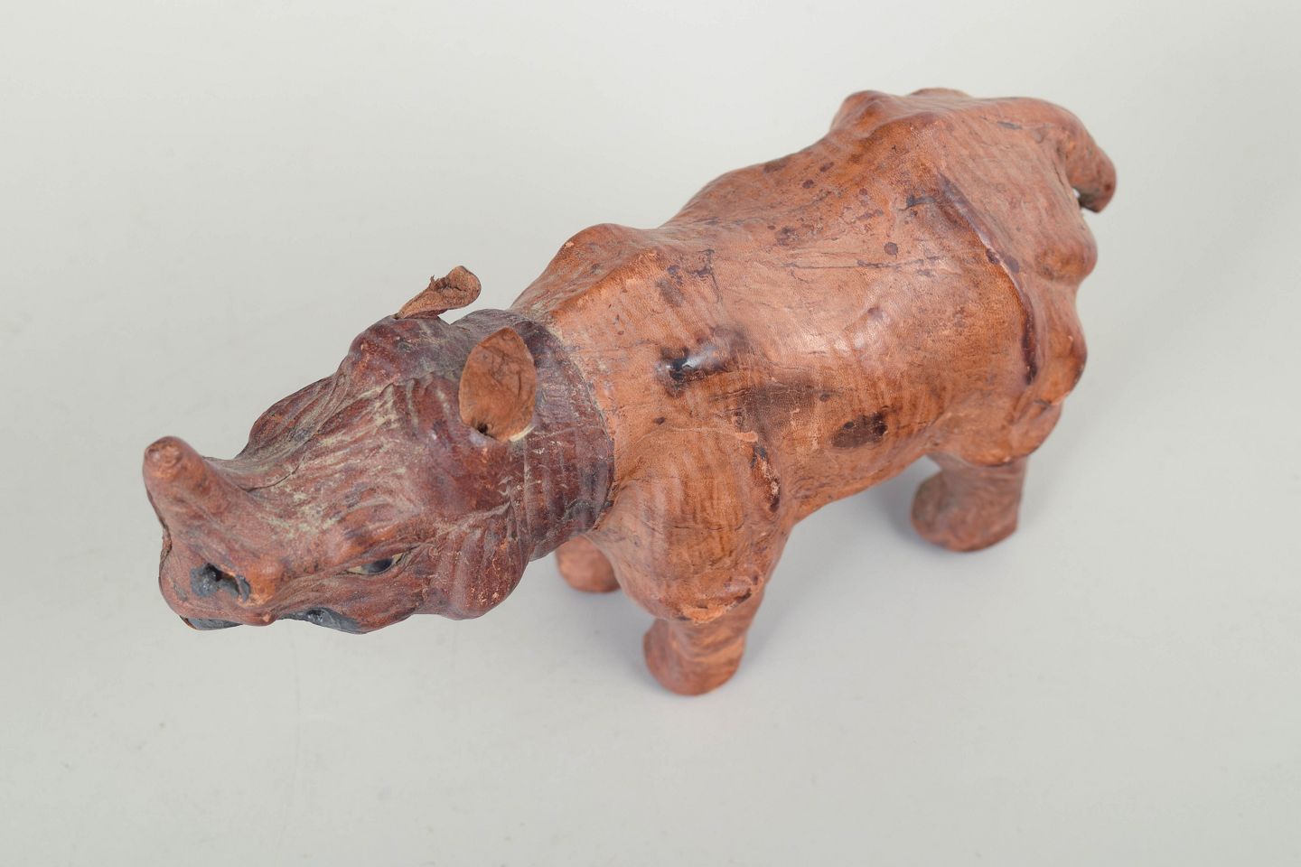 Omersa for Liberty & Co., London – Lille lædernæsehornsfigur, midt 1900-talletHåndlavet næsehornsfigur udført i formet og syet læder, muligvis solgt gennem Liberty & Co., London. Figuren har fint modellerede detaljer, udskårne øjne og en varm patineret overflade.