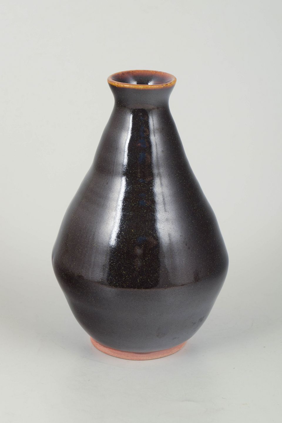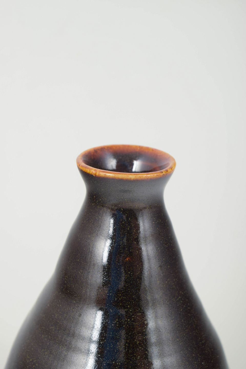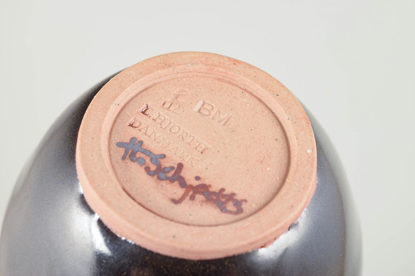 L. Hjorth, BornholmHånddrejet stentøjsvase med elegant konisk profil, dækket af en dyb, mørk glasur med diskrete spil i overfladen. Et klassisk eksempel på Bornholmsk keramiktradition, hvor håndværk og enkle former går op i en harmonisk helhed.