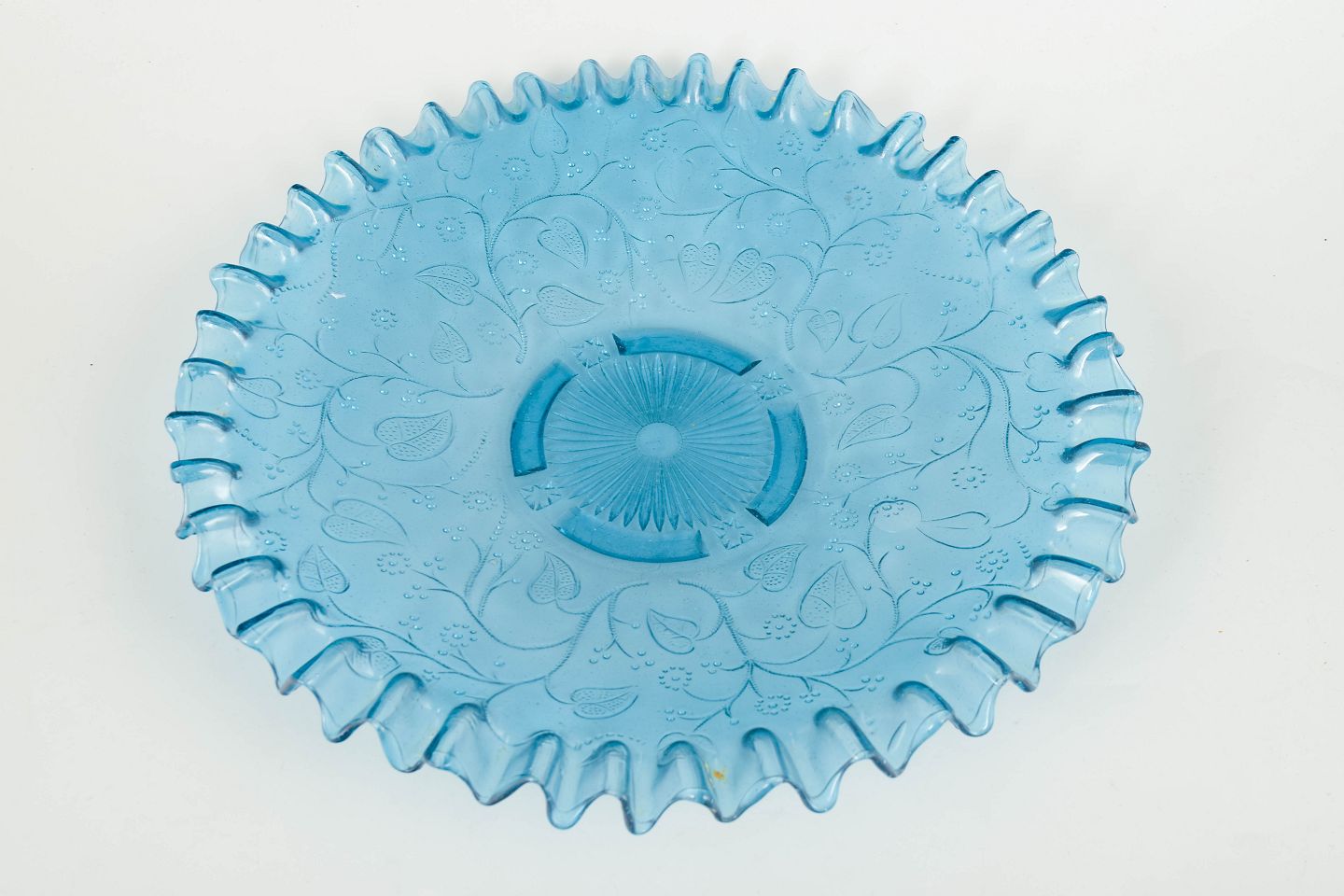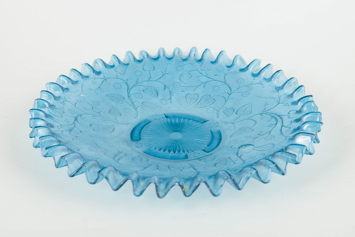 Glasfad, Skandinavien, tidlig 1900-tallet.Dekorativt glasfad i lyseblå presset glas med bølget kant og indpresset blomster- og rankemønster. Et typisk eksempel på nordisk glasproduktion fra perioden, hvor funktionelle hverdagsgenstande blev udformet med markant ornamental finesse.