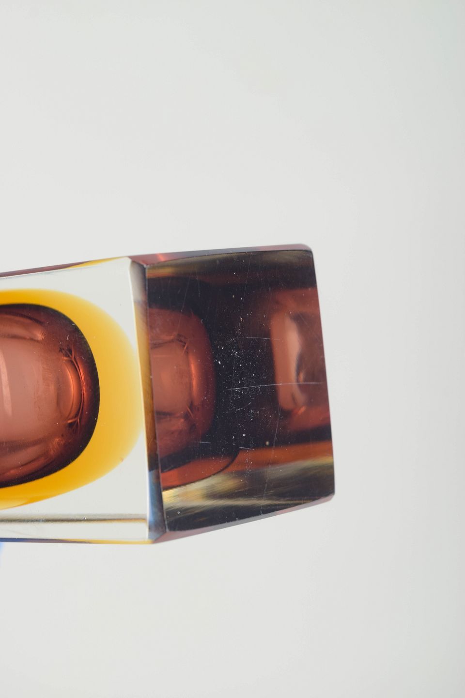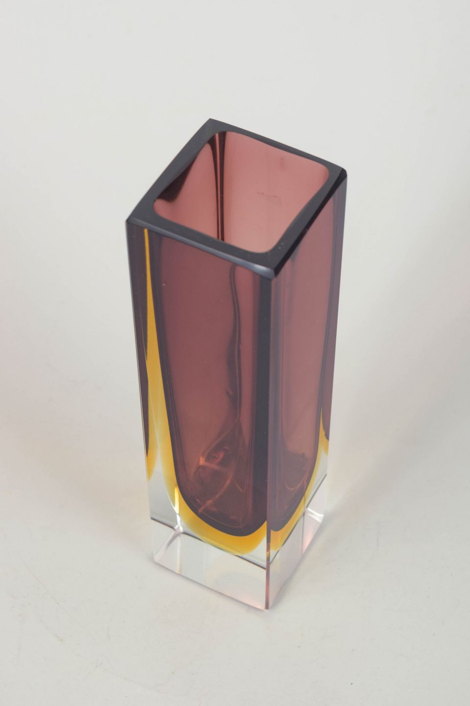 Murano Vase, 1960´erne.Rektangulær Murano-vase i lagdelt sommerso-glas med klar ydre krop, dyb ametystfarvet indre kerne og varme gule overgange. Et elegant eksempel på 1960’ernes italienske glasdesign, kendetegnet ved skarpe linjer og optiske farvespil.