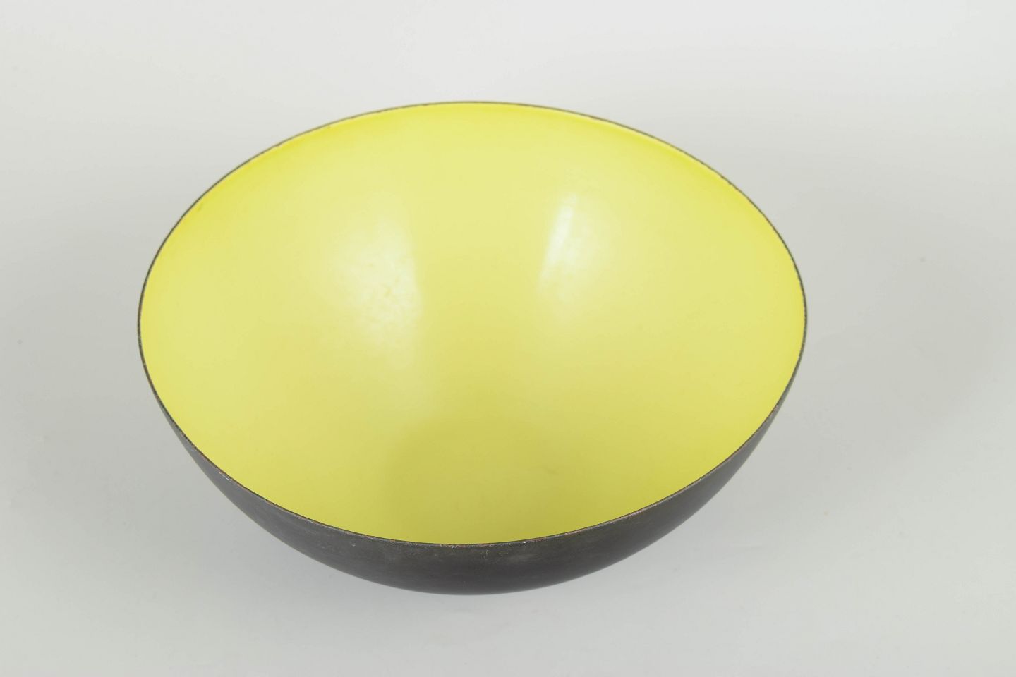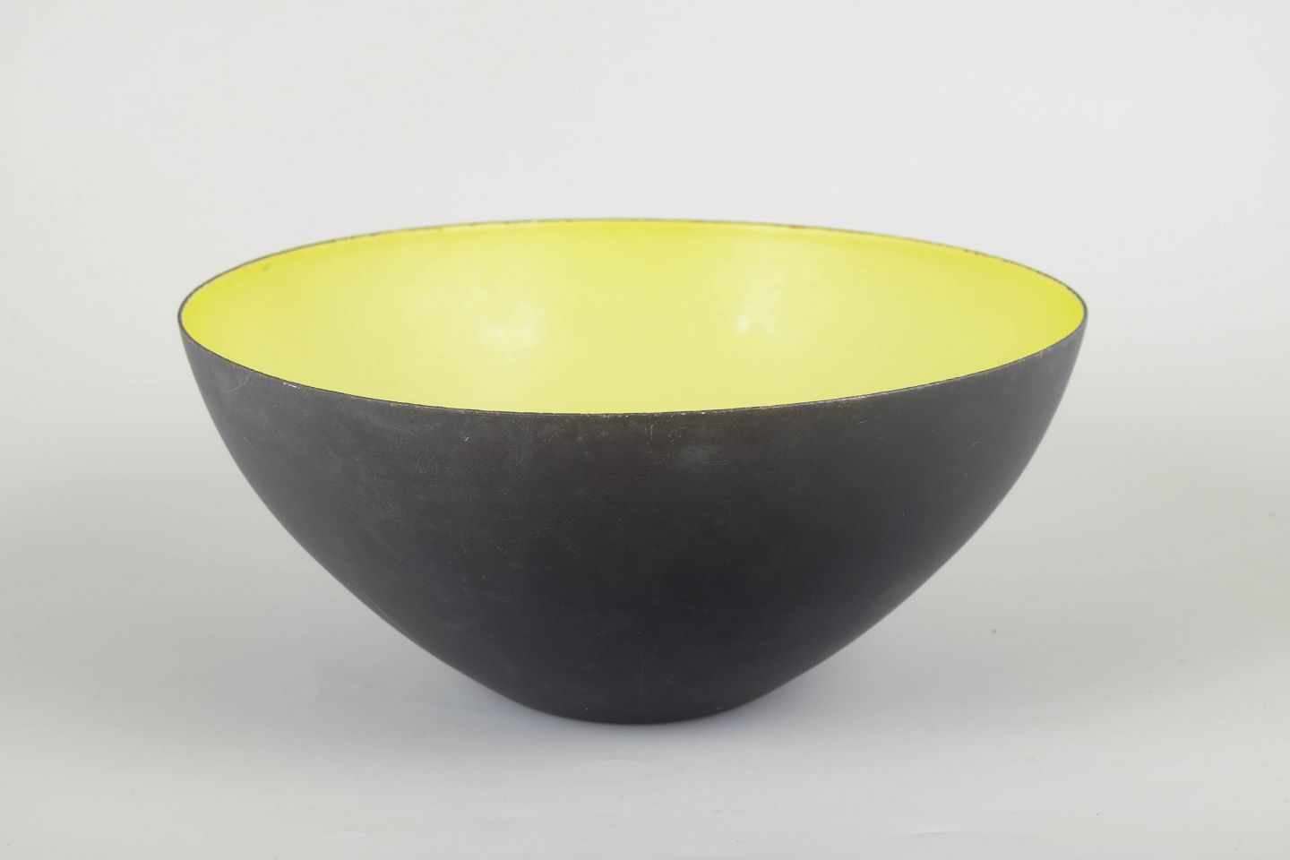 Krenit skål, 1960’erne.Klassisk dansk designskål i sortlakeret metal med emaljeret inderside i en sjælden gul farve. Den ikoniske halvkugleform giver et skarpt, minimalistisk udtryk, karakteristisk for Krenit-seriens tidløse design.