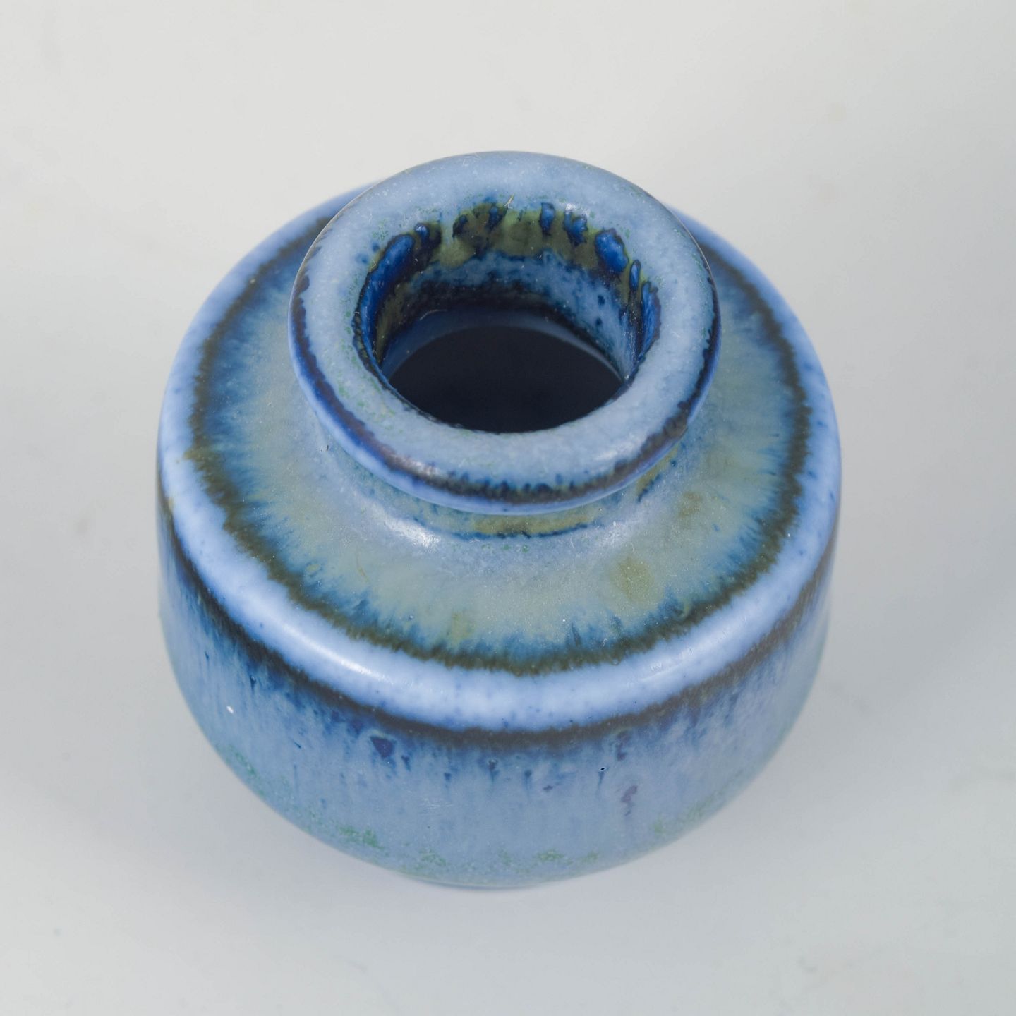 Lille miniaturevase i glaseret stentøj med kompakt cylindrisk form og nuanceret blågrøn løbende glasur.