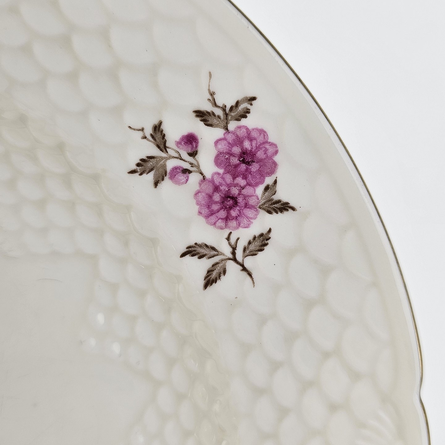 Volmer er porcelæn i skelform med guldkant og motiv af lyserøde blomster