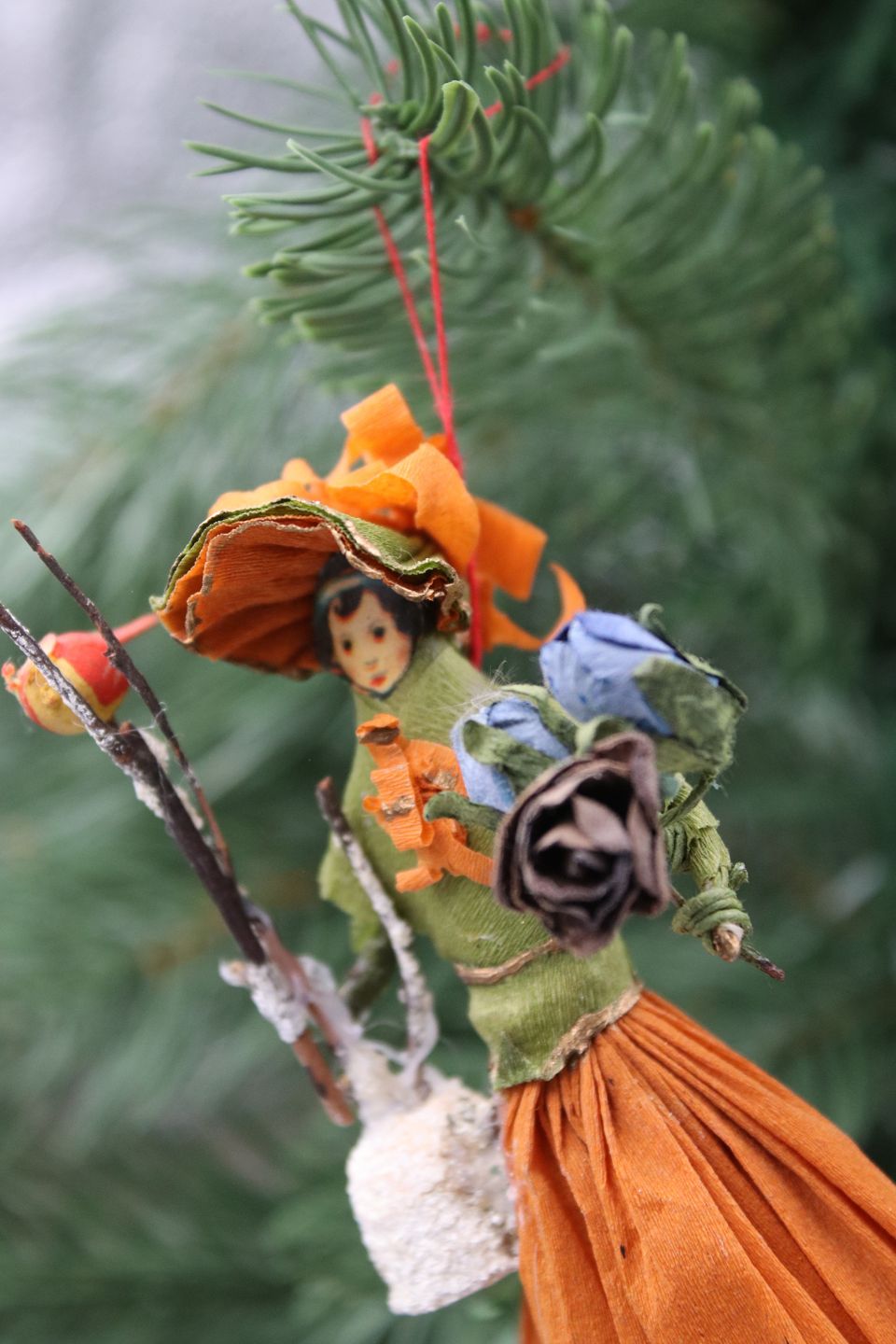 Gammelt juletræspynt , fin dame lavet i farvet krep papir med blomster buket og gren med en lille fugl i toppen.