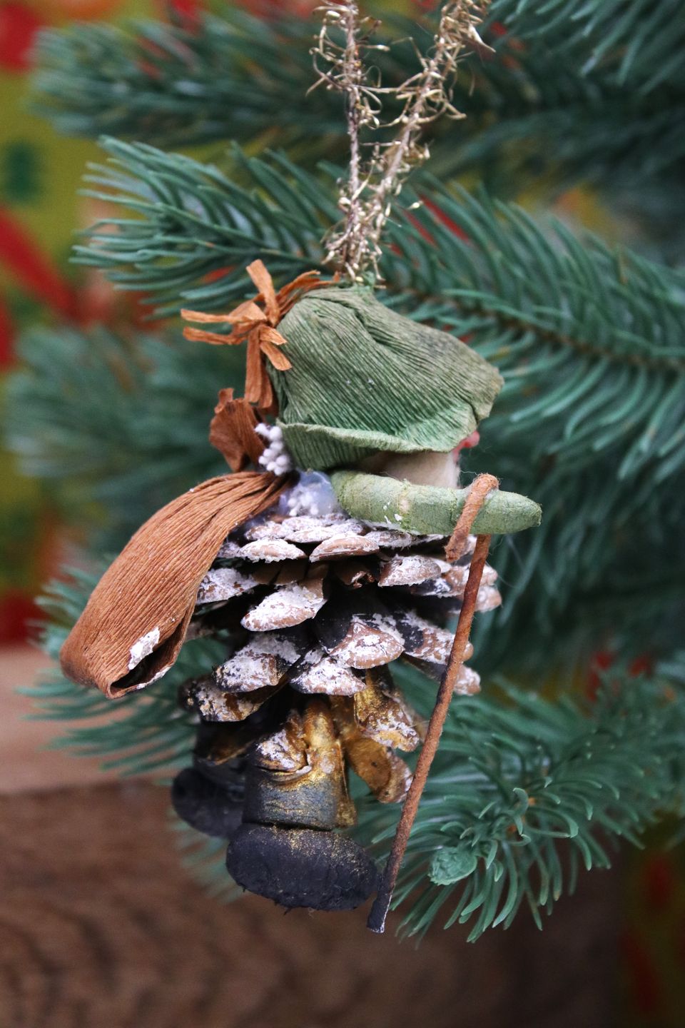 Gammel juletræspynt i form af nisse med stok og rygsæk lavet af grankogle , vat , krep papir og ansigt i papmache.Højde: 9cm.