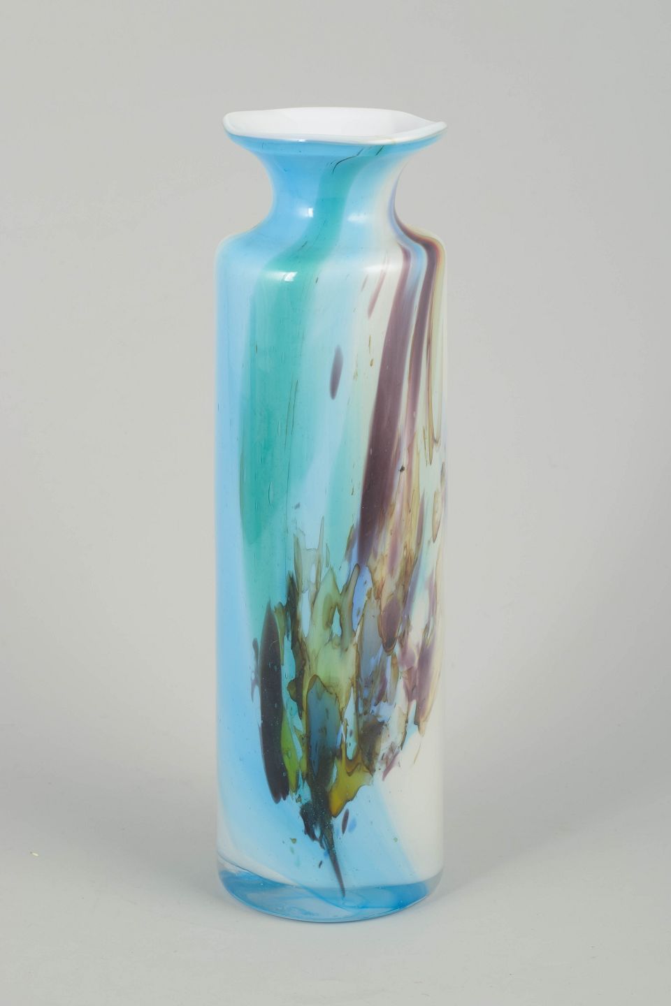 Tall mouth-blown cylindrical glass vase by Per Lütken with striking fused colour fields in turquoise, white, brown, yellow and green. The colours flow in a painterly, abstract manner, while the gently flared neck adds an elegant, sculptural touch.