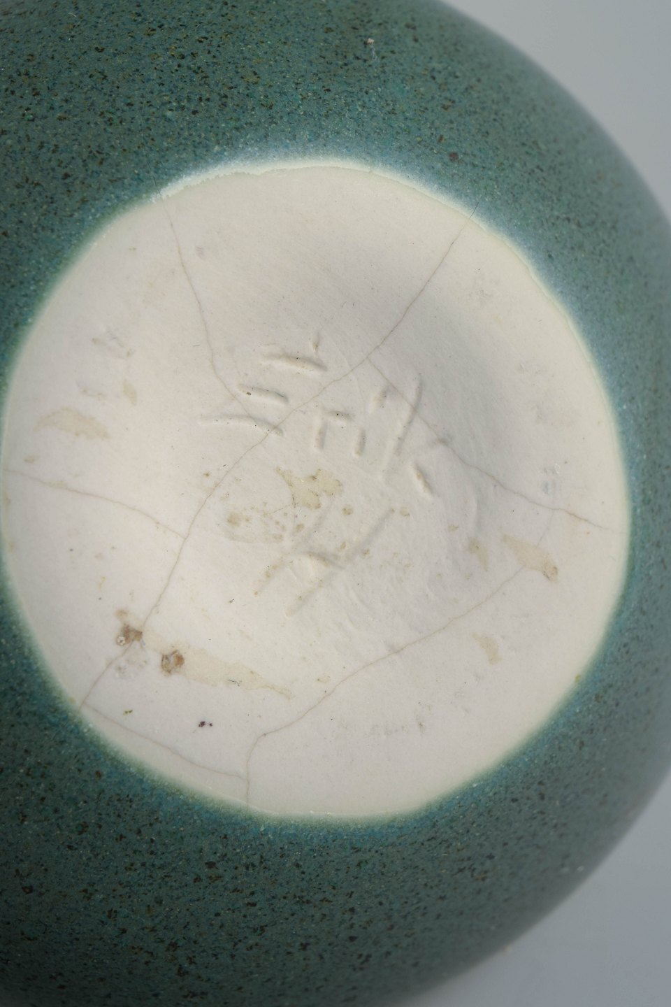 Lille, hånddrejet vase i stentøj med glat, afrundet krop og slank hals. Glasuren er i bløde turkis- og grønne nuancer med let spil og levende overgange, typisk for skandinavisk studiokeramik i perioden.