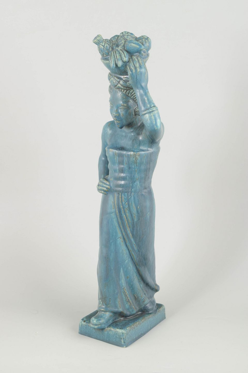 Stor, monumentalt formet Art Deco skulptur i stentøj med markant geometrisk silhuet og dyb, flerlaget glasur i brune og jordede nuancer. Et sjældent og iøjnefaldende arbejde i stor skala.