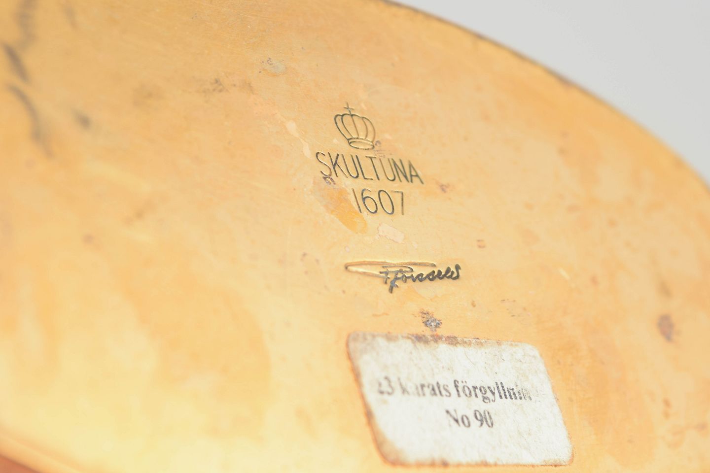 Elegant og skulpturel Lommelærke i messing, 23 karat guldbelagt, designet af Pierre Forssell for Skultuna. Den karakteristiske ovale krop og det stramt geometriske låg viser Forssells raffinerede modernistiske formsprog.
