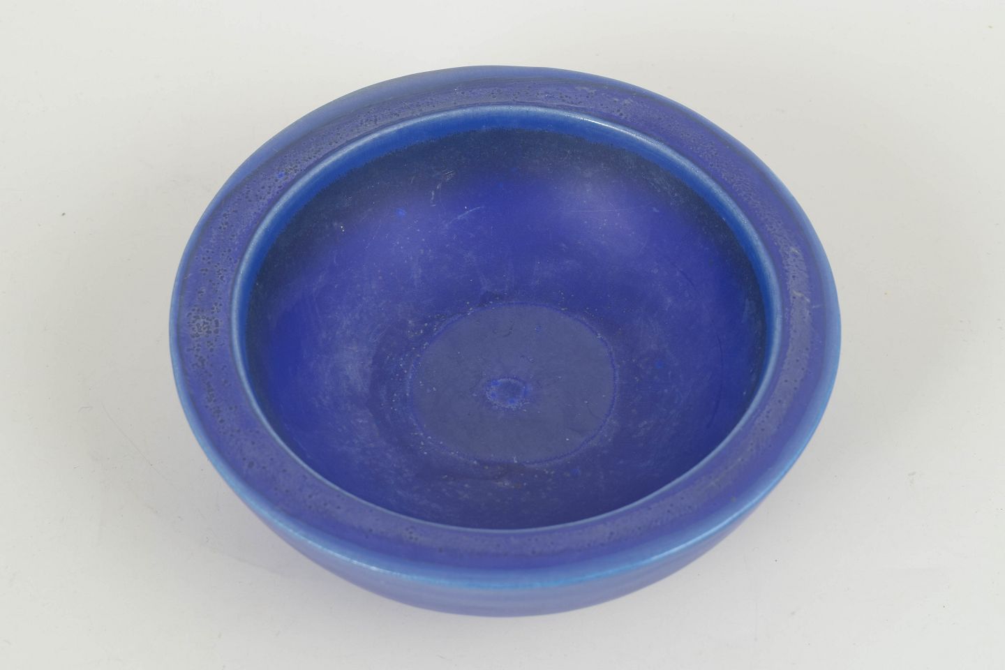 Mat, dybblå stentøjsskål med eksperimentel testglasur, typisk for Kåges arbejde i Gustavsbergs kunstneriske udviklingsfase. Den enkle, afrundede form fremhæver glasurens taktile, næsten pudrede karakter.