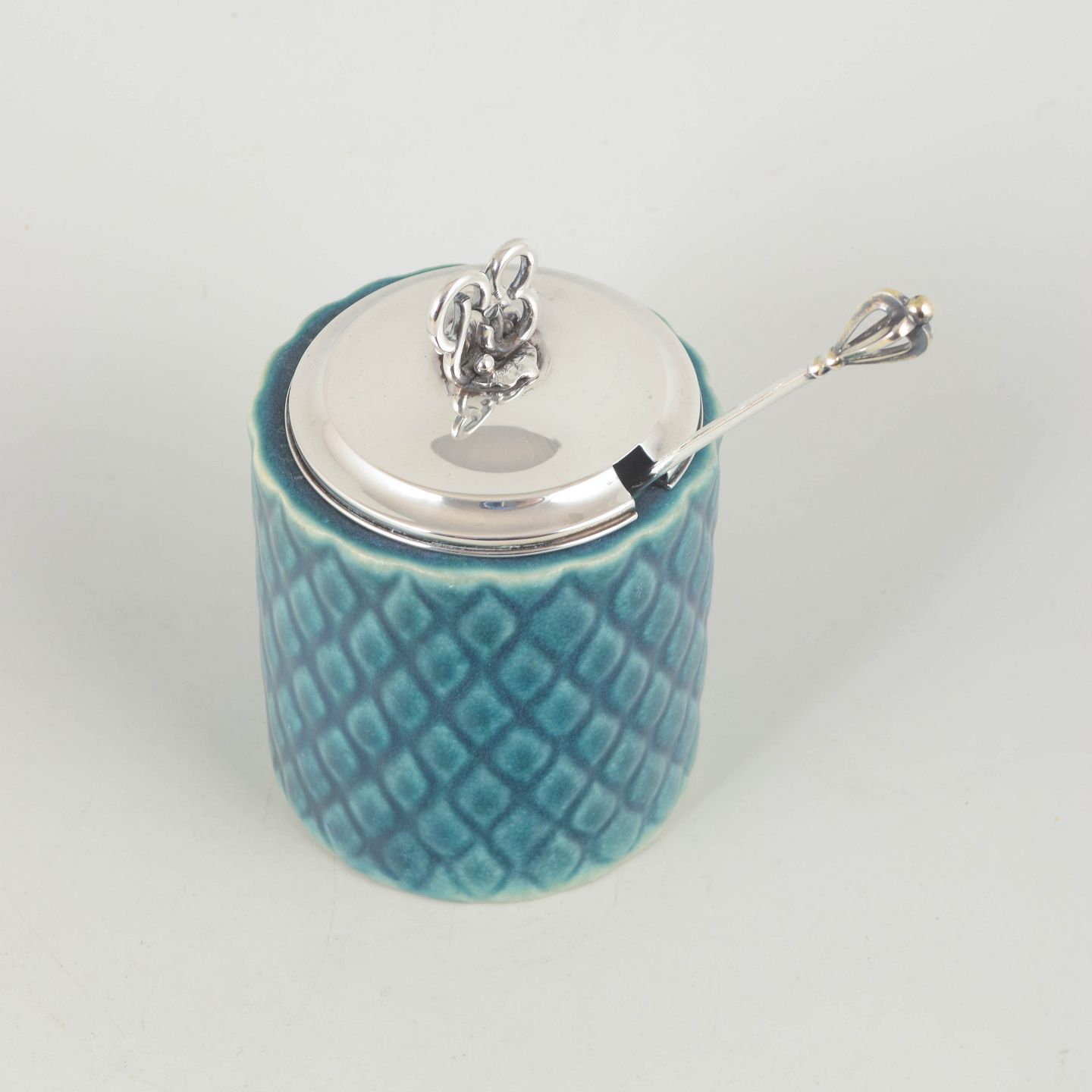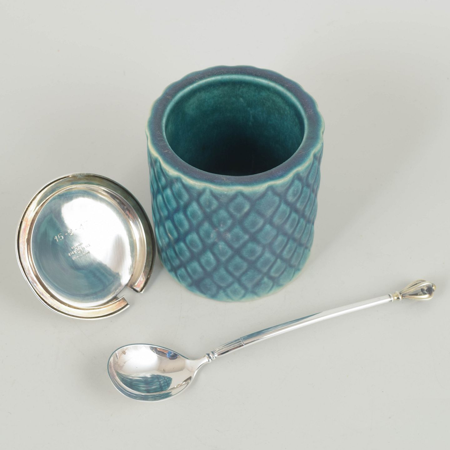 Erik Rahr for SaxboMarmeladekrukke med tretårnet låg og tretårnet sølvske, midt 1900-tallet.
