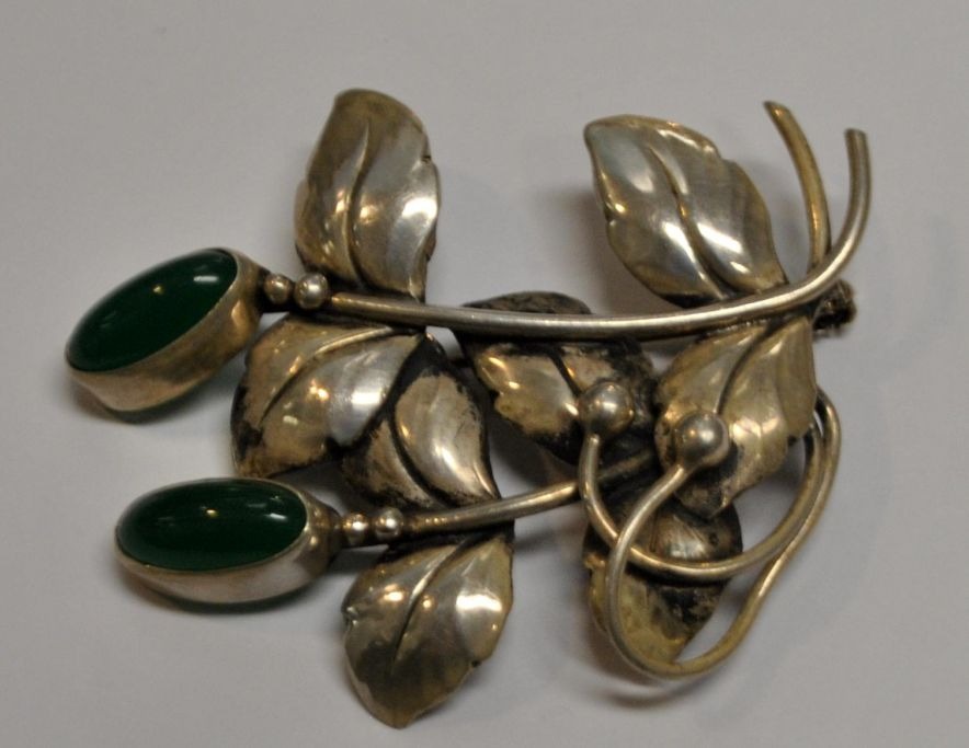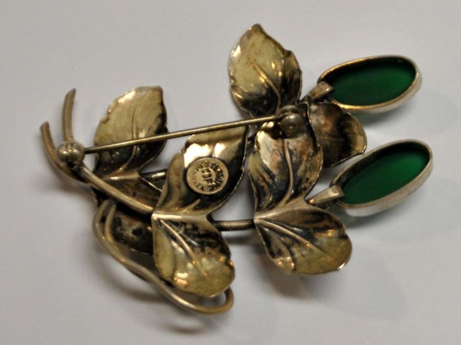 Karin Borup, Købehavn - Birkerød (2010 - ): Brosche i sterlingsølv. Med to grønne sten. Stemplet: COP. 6 x 5 cm.Emne nummer: 28714