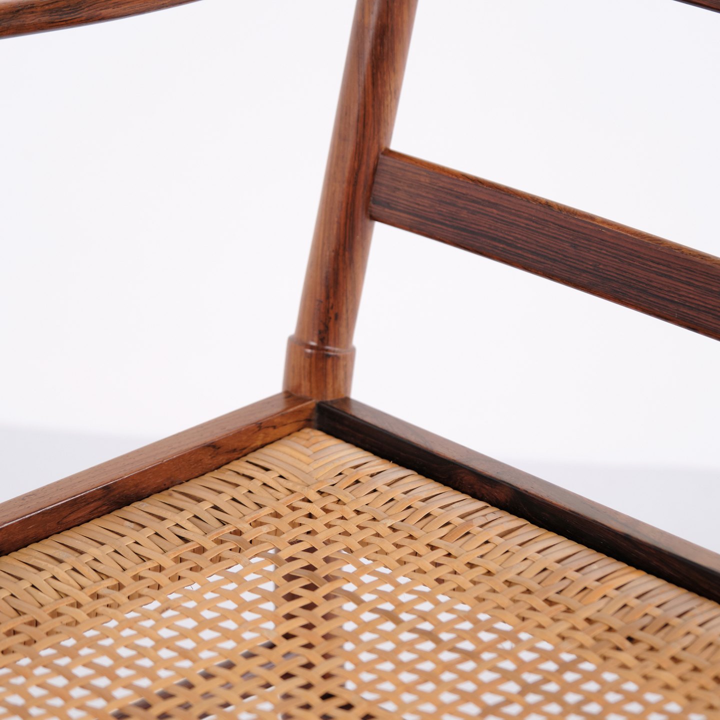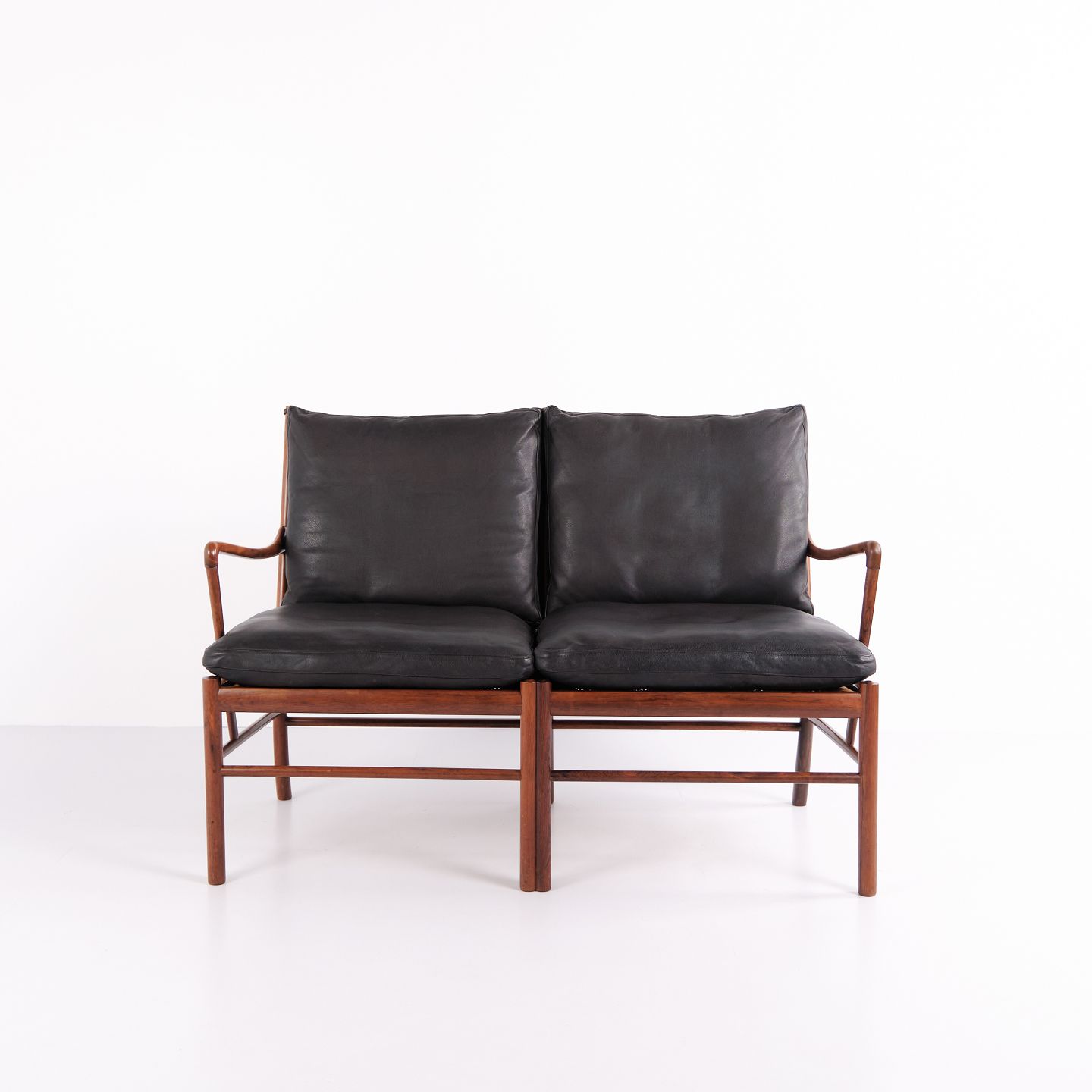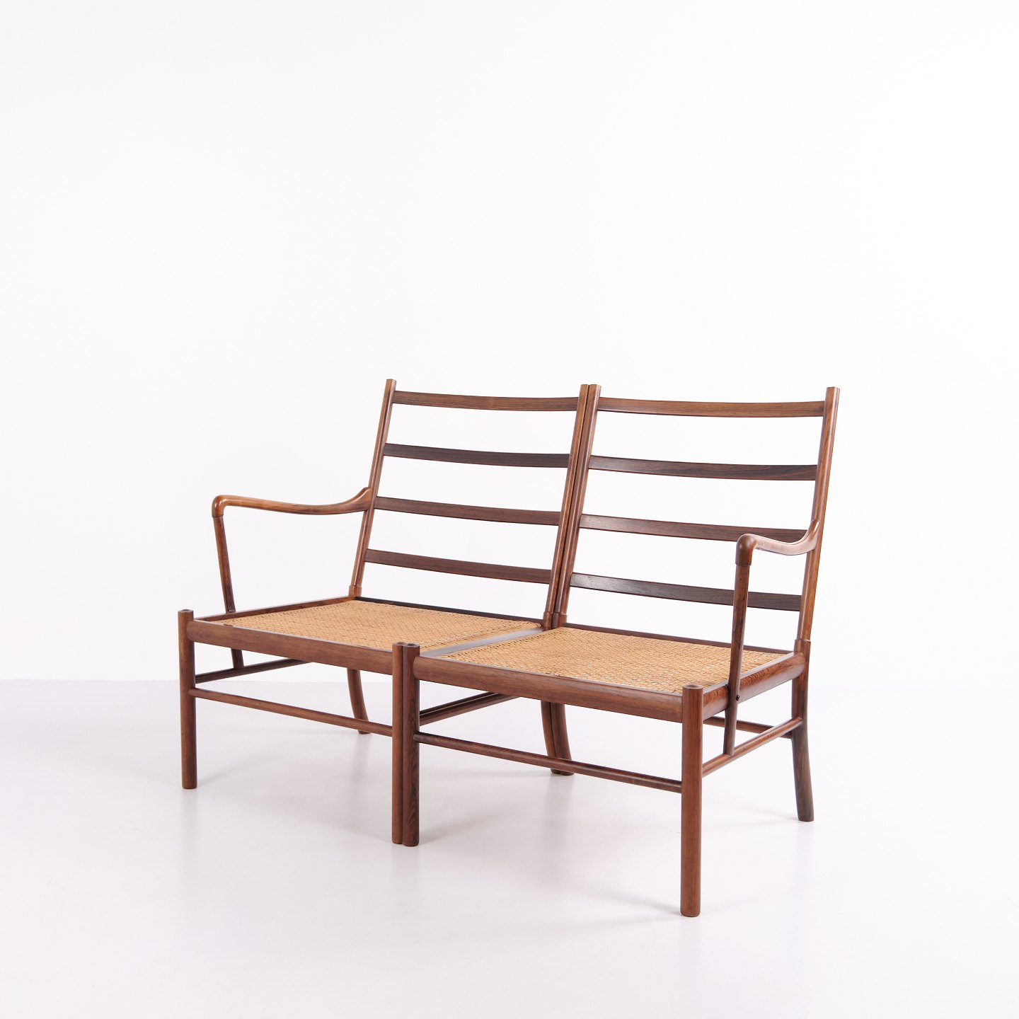 Colonial 2-pers. sofa, model OW149-2, designet af Ole Wanscher og fremstillet af P. Jeppesen omkring 1960. Udført i palisander med flettet sæde og løse hynder. Ole Wanscher var en central skikkelse i dansk møbeldesign og kendt for sit elegante, klassisk inspirerede formsprog. P. Jeppesen var hans faste producent gennem flere årtier og stod for en særligt høj håndværkskvalitet, der gjorde Wanschers møbler eftertragtede både i samtiden og i dag. Colonial-serien er blandt hans mest ikoniske værker.— Designer: Ole Wanscher