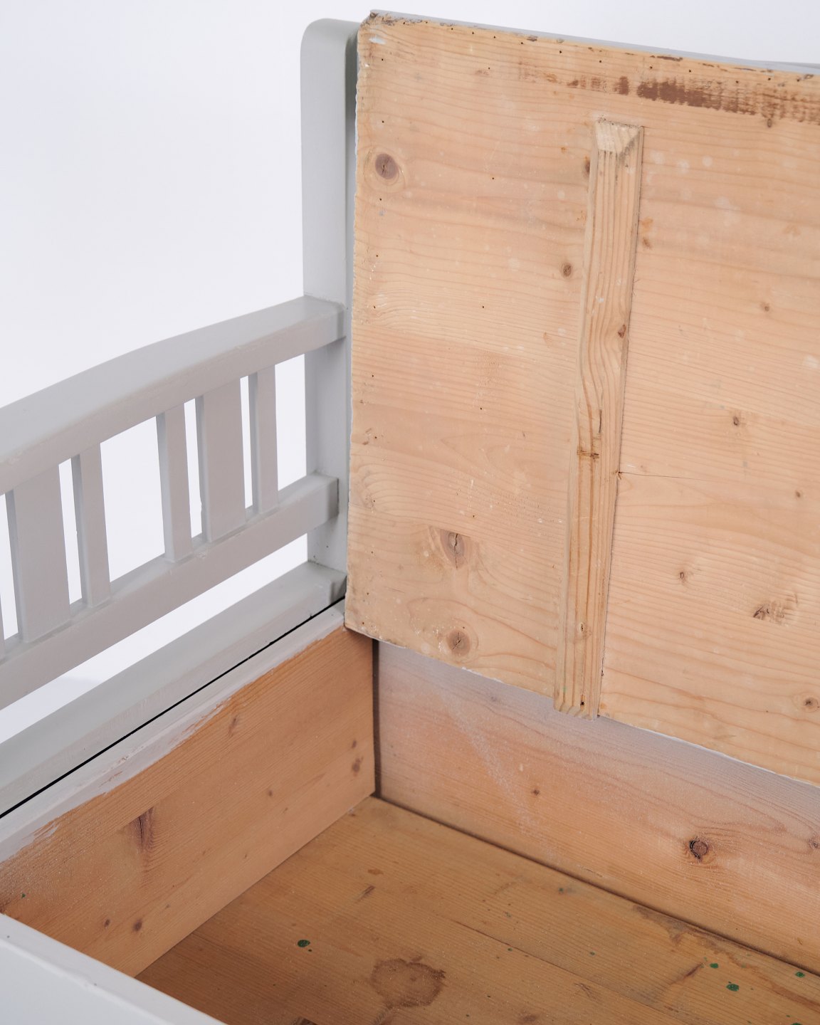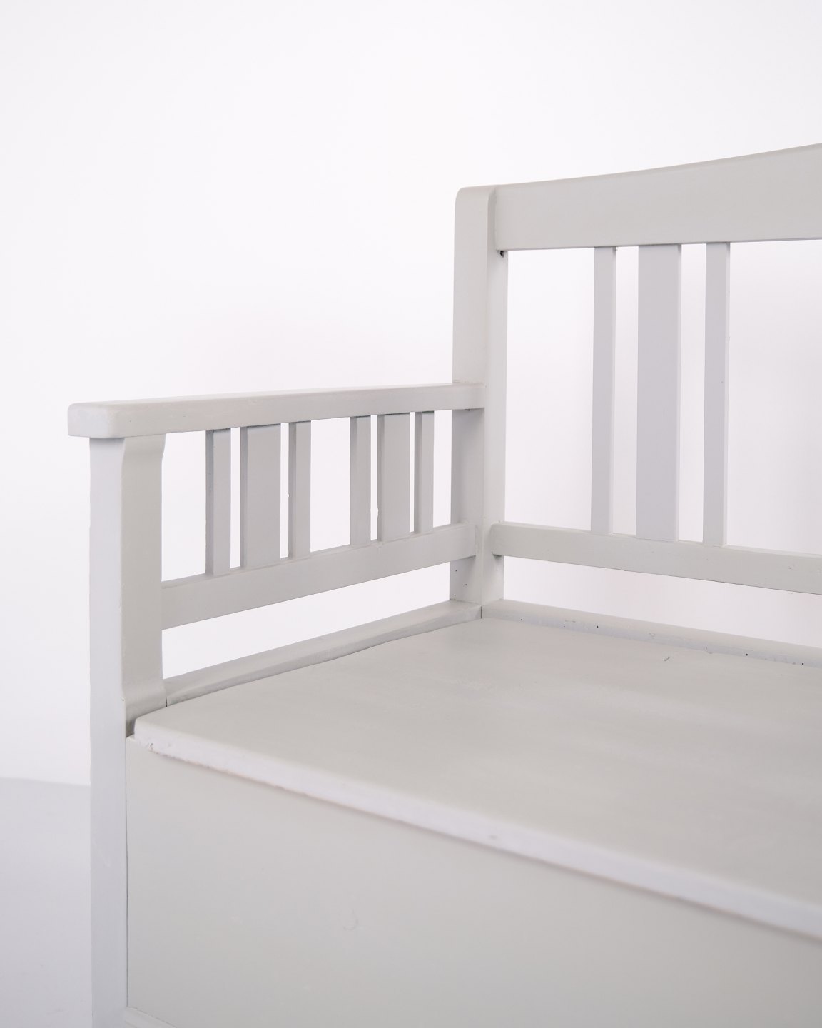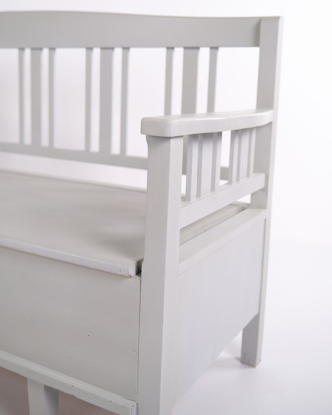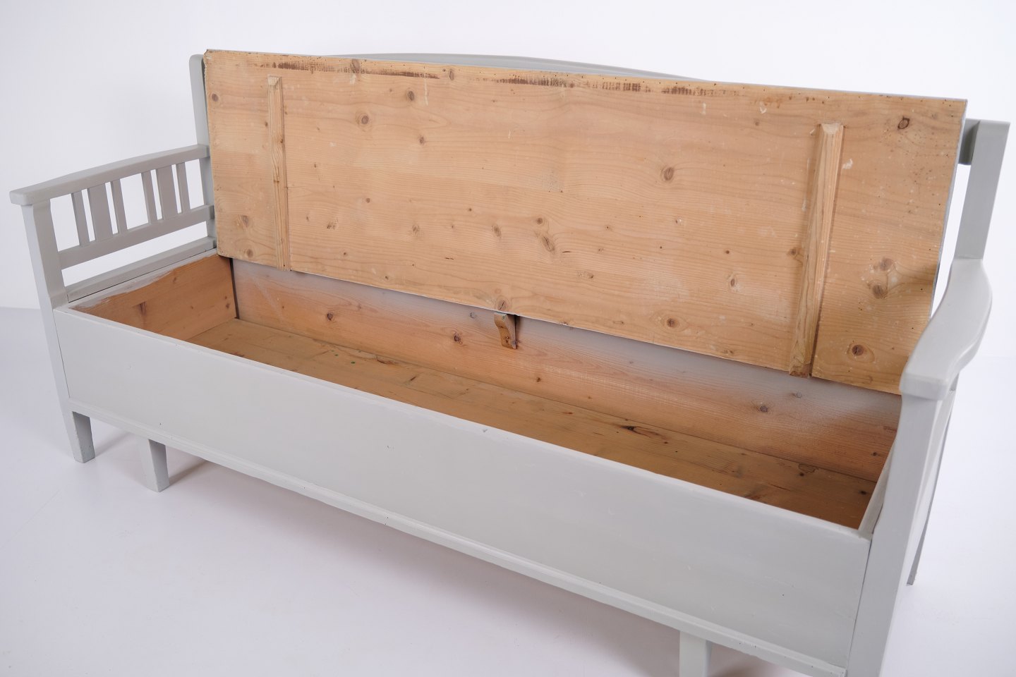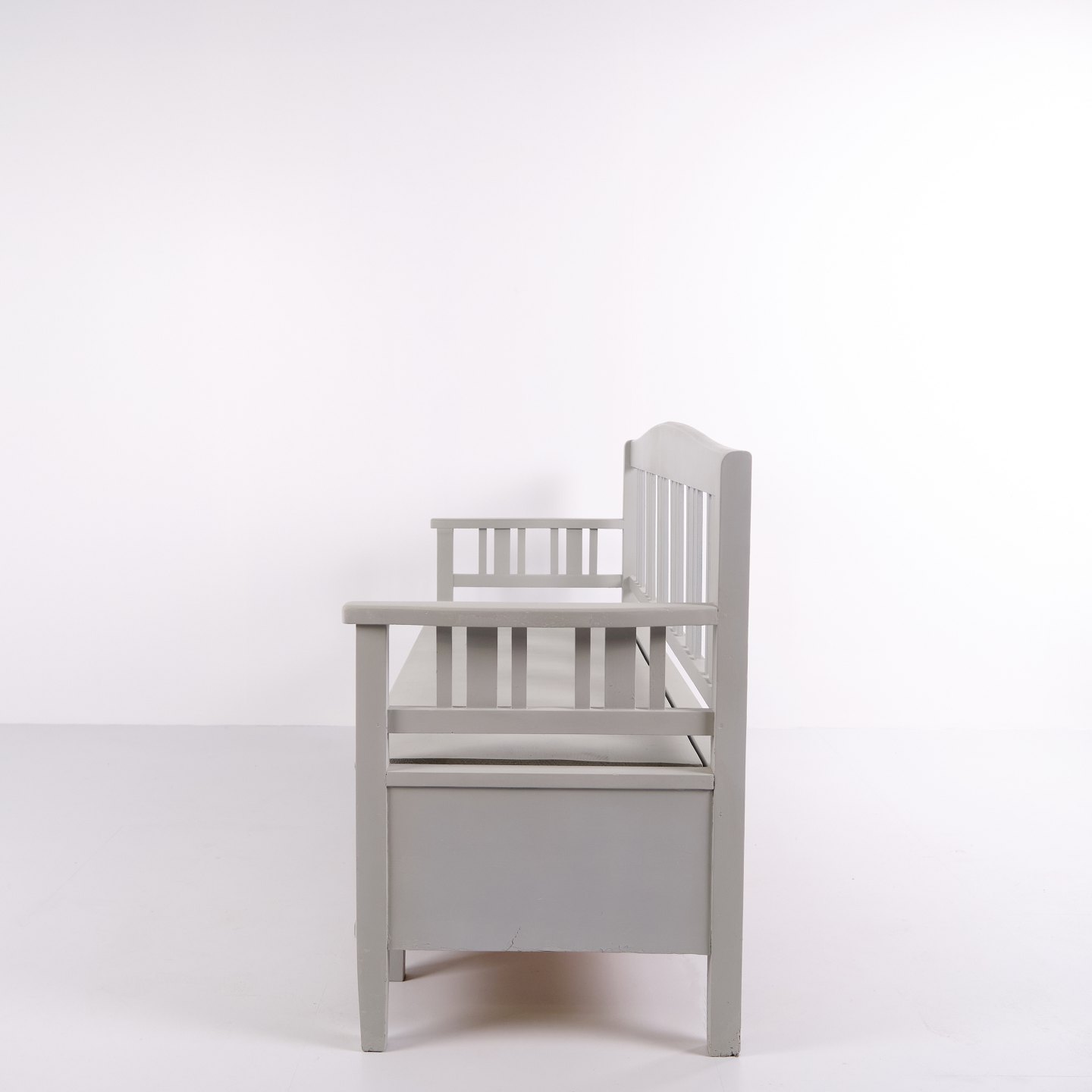Svensk slagbænk fra ca. 1860’erne, udført i fyrretræ og gråmalet i senere tid. Klassisk skandinavisk møbel med dekorative bemalinger og god opbevaringsplads under sædet. Velbevaret antikt møbel med tidstypiske detaljer.— Oprindelse: Sverige