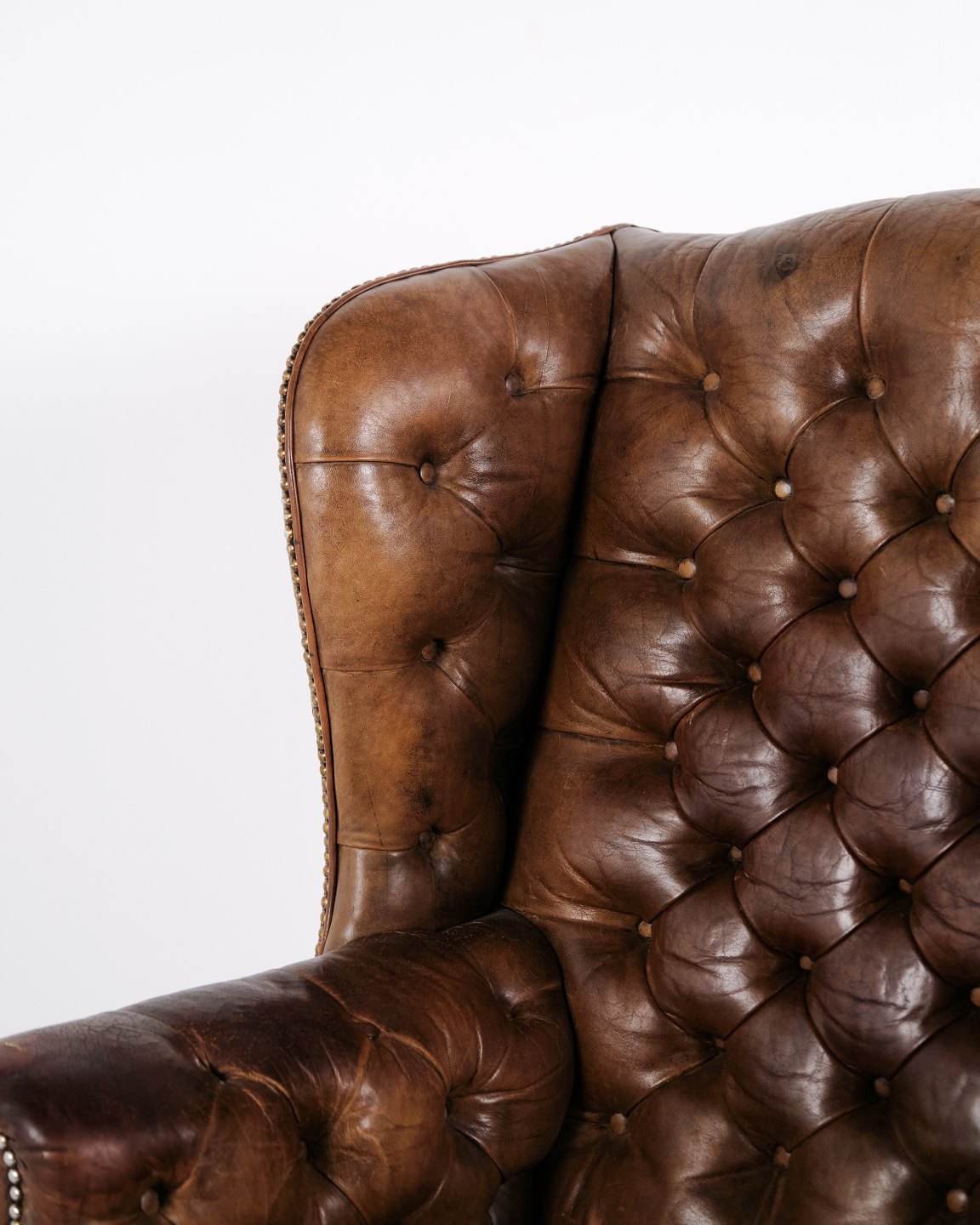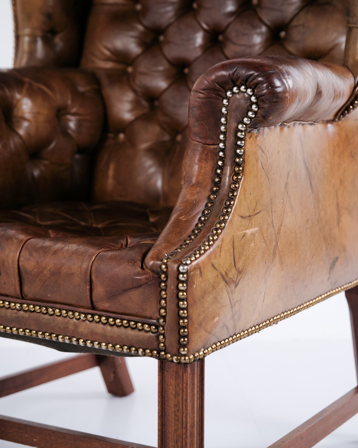 Høj kvalitet wingback armstol fra ca. 1910 i brunt originalt læder. Klassisk højrygget model med markante vinger og kraftigt stel. Med tilhørende skammel i samme udførelse. Stolinspiration fra George III-periodens engelske møbeltradition. Velbevaret original læderpolstring med smuk patina.— Periode: Ca. 1910