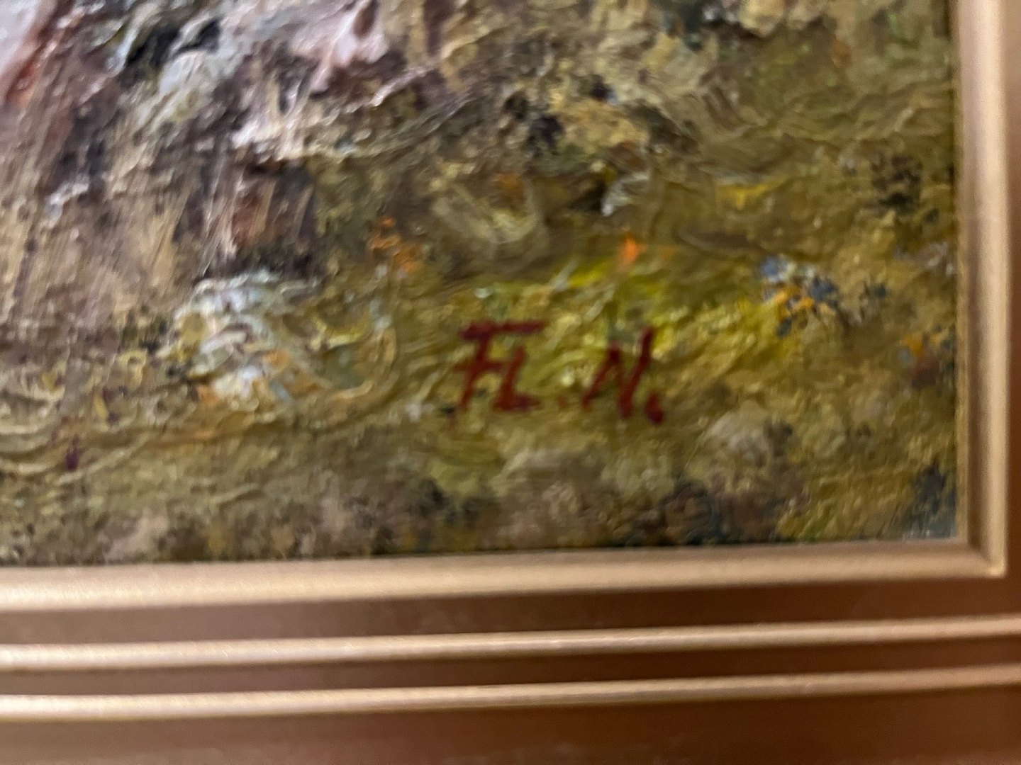 Beskrivelse:Oliemaleri af FL.N, der skildrer en dramatisk klippekyst med vegetation og hav, udført i en realistisk til let impressionistisk stil. Værket er indrammet i en elegant guldramme.