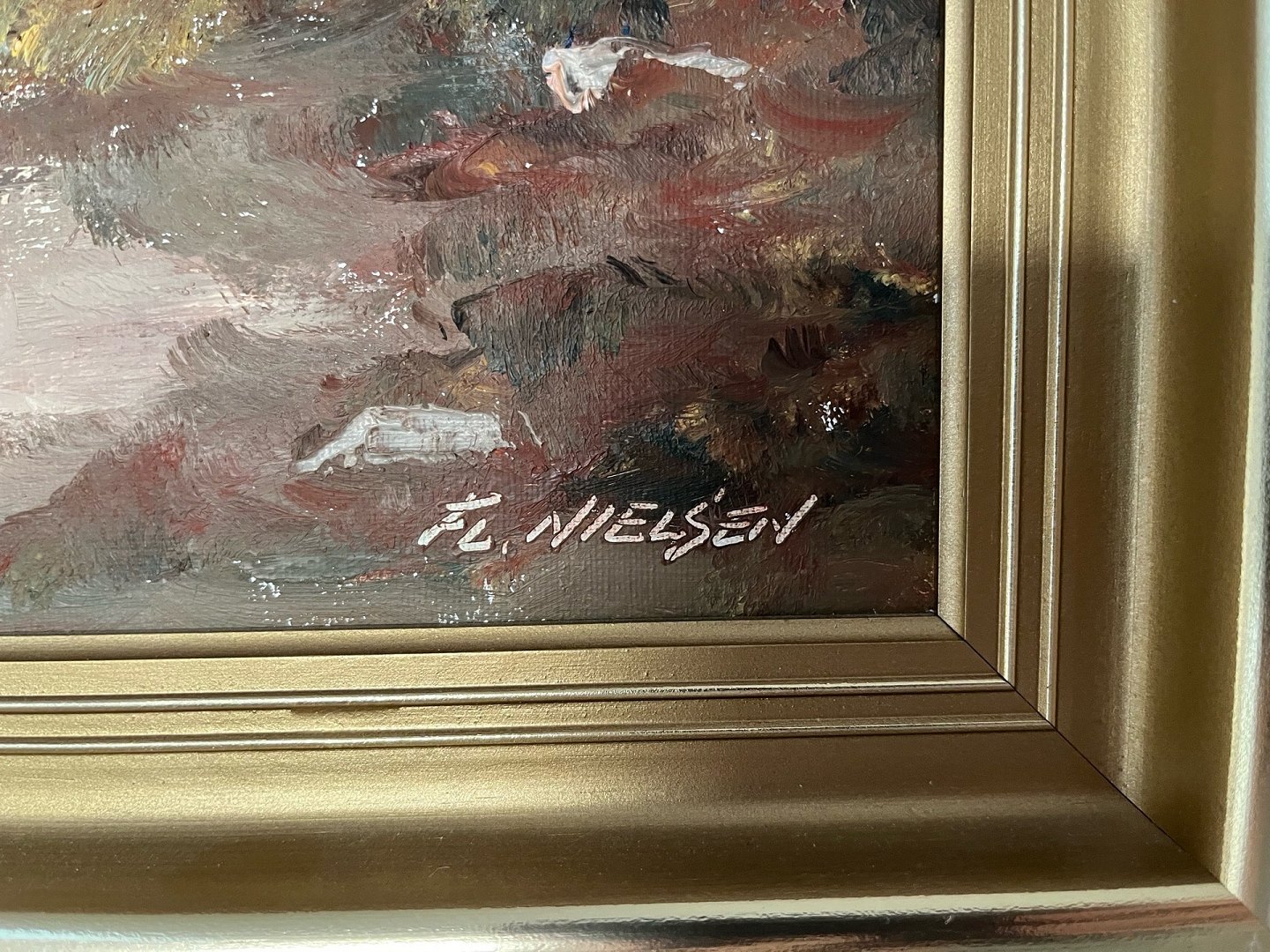 Oliemaleri af Flemming NielsenMaleriet er et oliemaleri signeret af den anerkendte danske kunstner Flemming Nielsen (også kendt som Flemming Flev Nielsen). Kunstneren er særligt kendt for sine naturalistiske landskabs- og figurkompositioner, ofte inspireret af de bornholmske klipper og kyststrækninger.